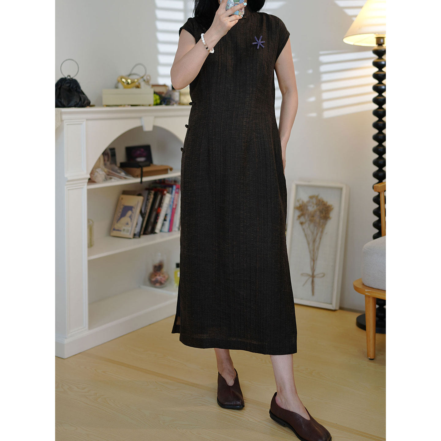6号衣橱 l 新中式"柿野" 香云纱工艺亚麻面料 手工盘扣旗袍连衣裙
