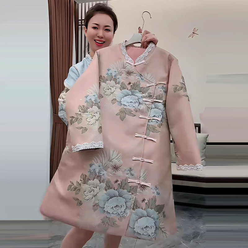 2025秋季新款烫金加厚锦棉气质斜门襟盘扣旗袍连衣裙大码宽松裙子