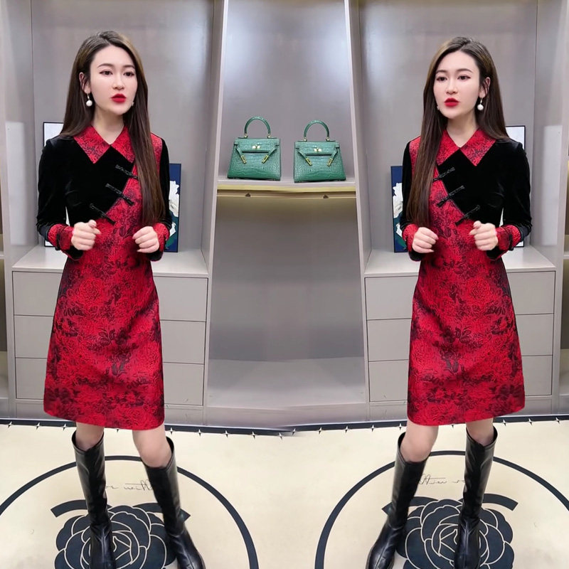 网红爆款2025早春新款气优雅金丝绒拼接中国风盘扣旗袍连衣裙女