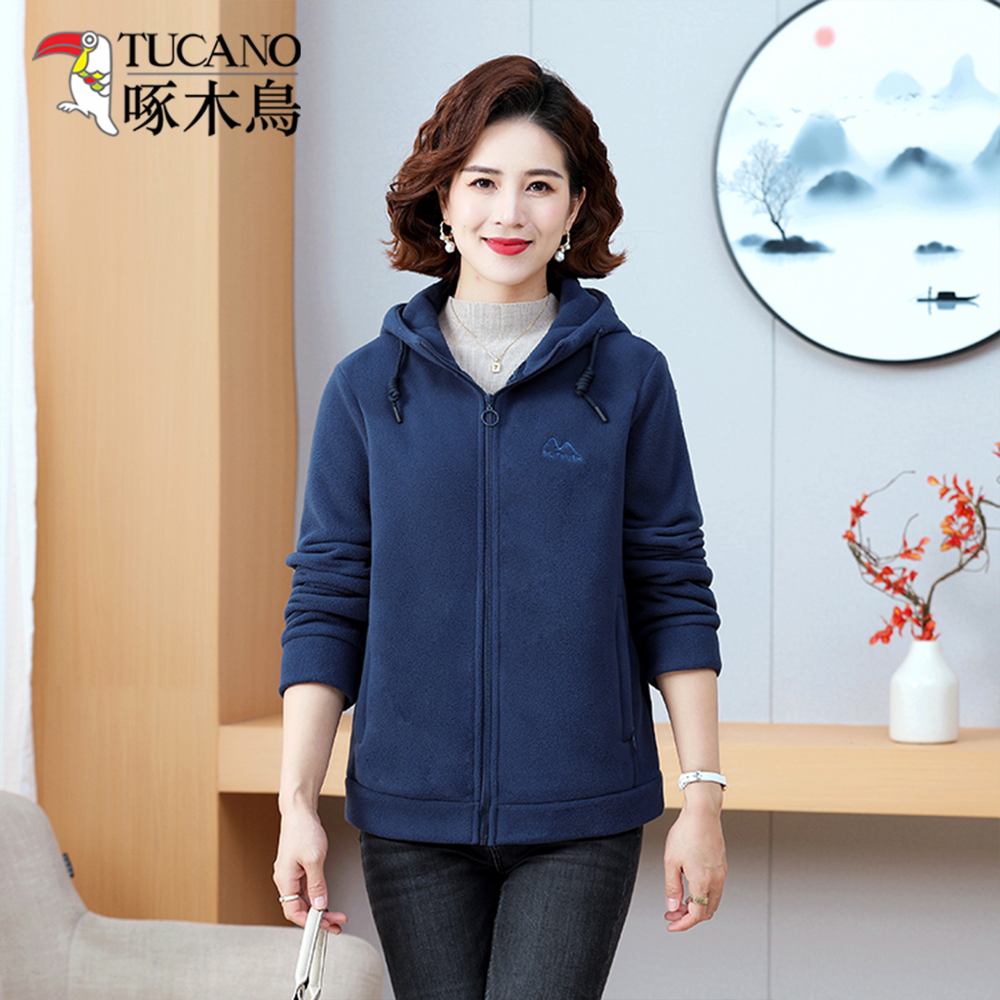 啄木鸟奥粒绒外套女秋冬2025款中老年妈妈开衫连帽卫衣双面绒上衣
