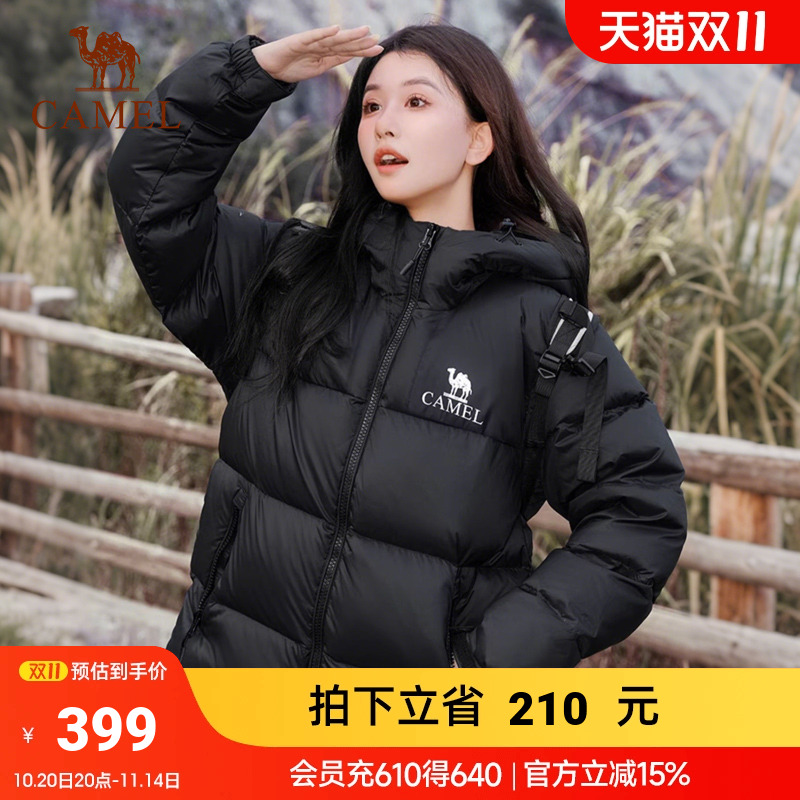 骆驼熊猫系列户外羽绒服男款冬季连帽加厚外套防泼水黑色面包服女