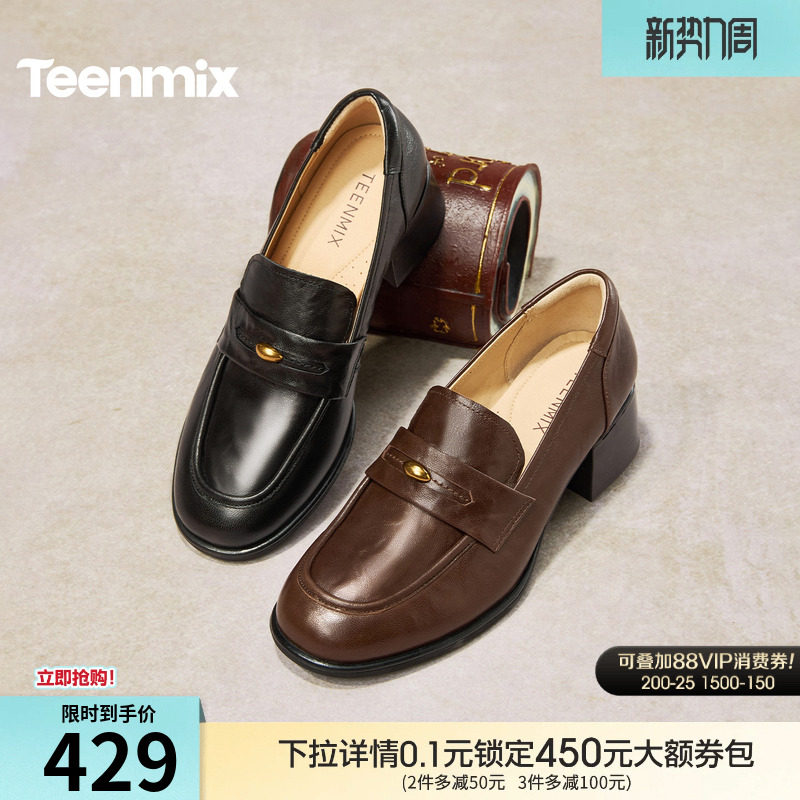 天美意粗跟厚底增高英伦乐福鞋复古单鞋女高跟小皮鞋2026春季新款