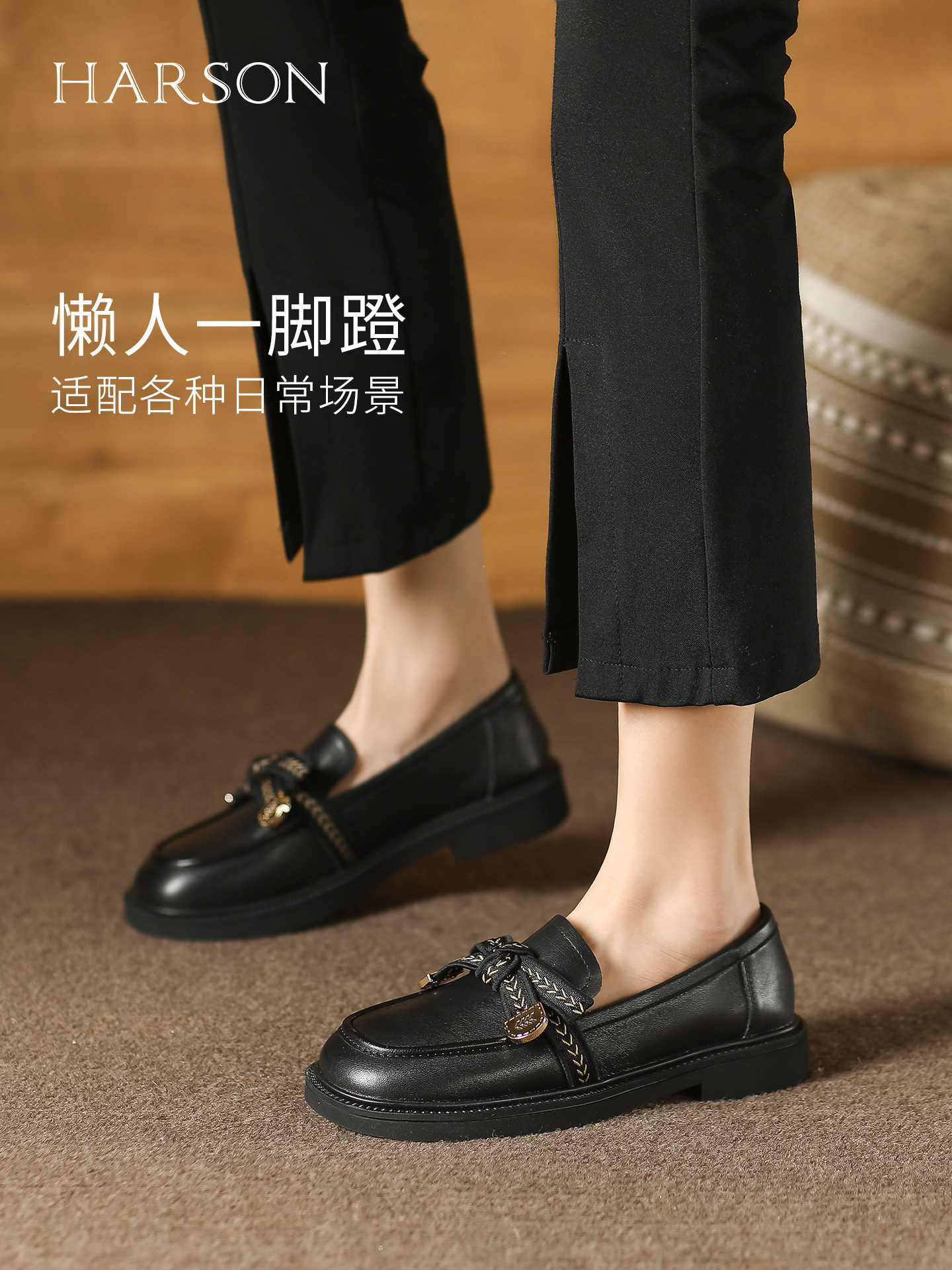 哈森经典黑色乐福鞋蝴蝶结舒适小皮鞋软底单鞋2026新款HWS260169