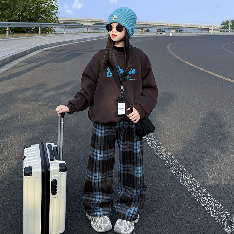 女童加绒套装冬款2025中大童秋冬一体绒圆领卫衣格子阔腿裤两件套