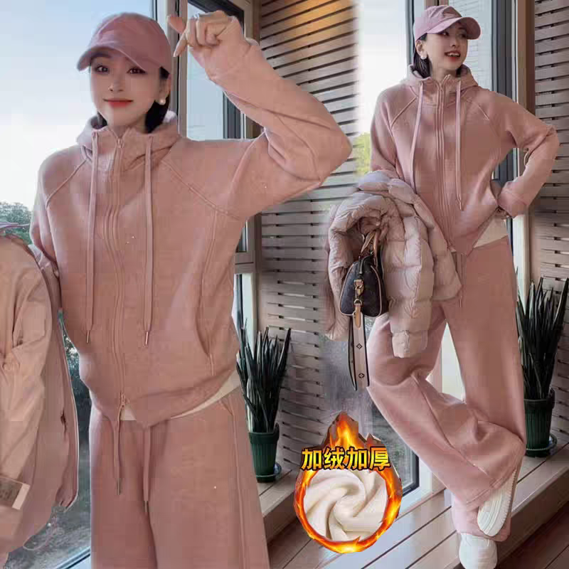 加绒加厚时尚休闲套装女2025秋冬新款洋气连帽开衫阔腿裤两件套潮