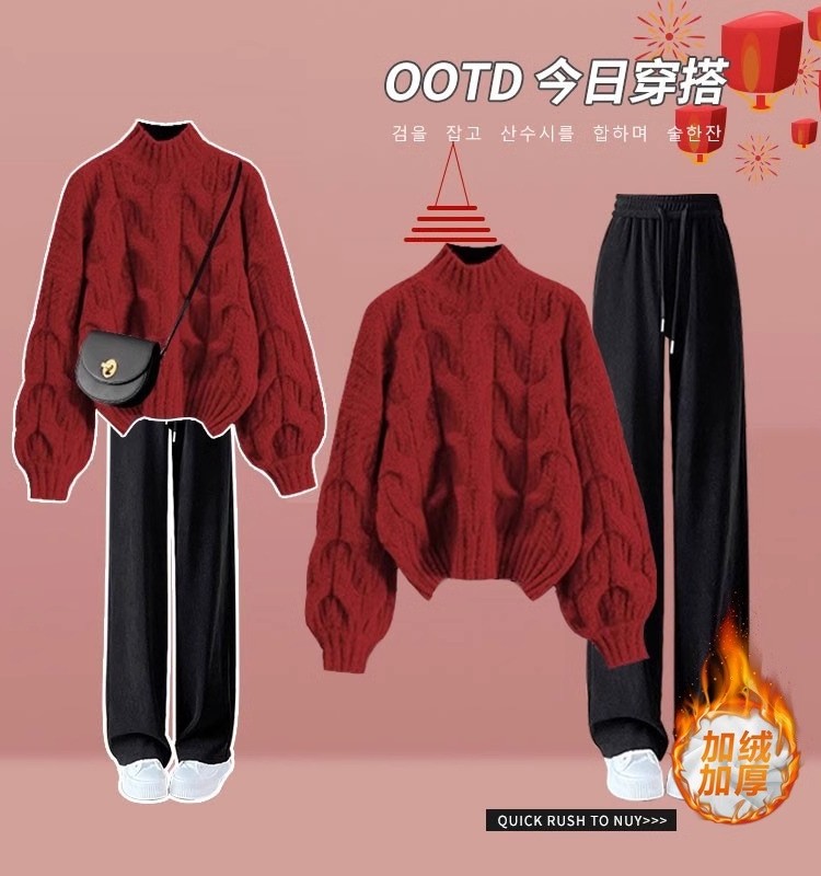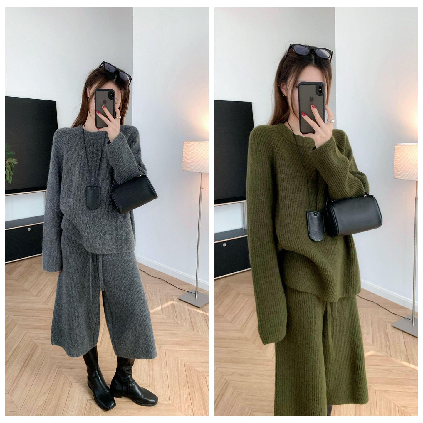 时髦两件套 插肩圆领宽松毛衣+阔腿七分裤休闲裤秋冬厚实针织套装