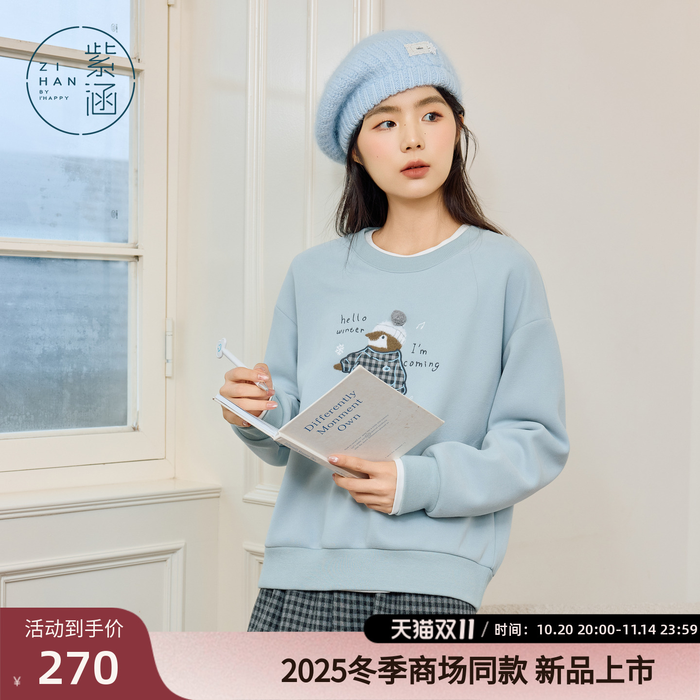 紫涵圆领加绒卫衣女2025年冬季新款卡通企鹅刺绣宽松保暖套头上衣
