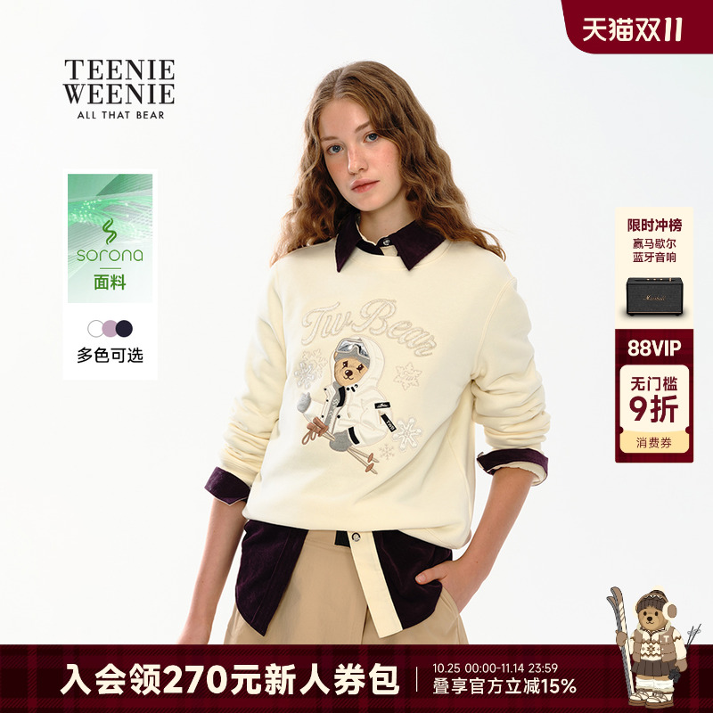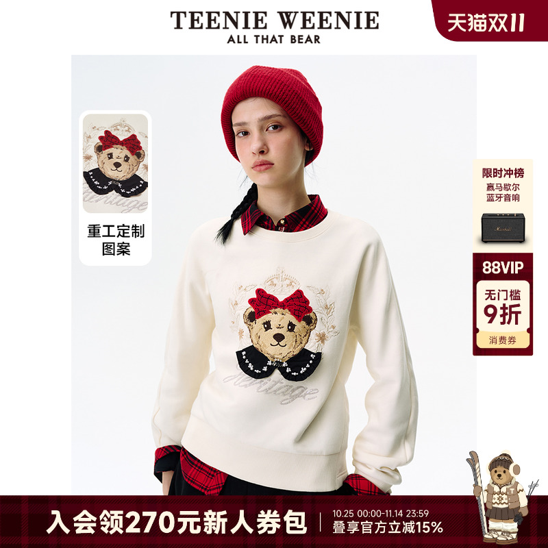 TeenieWeenie小熊女装卫衣秋冬季圆领时尚刺绣学院风白色休闲上衣