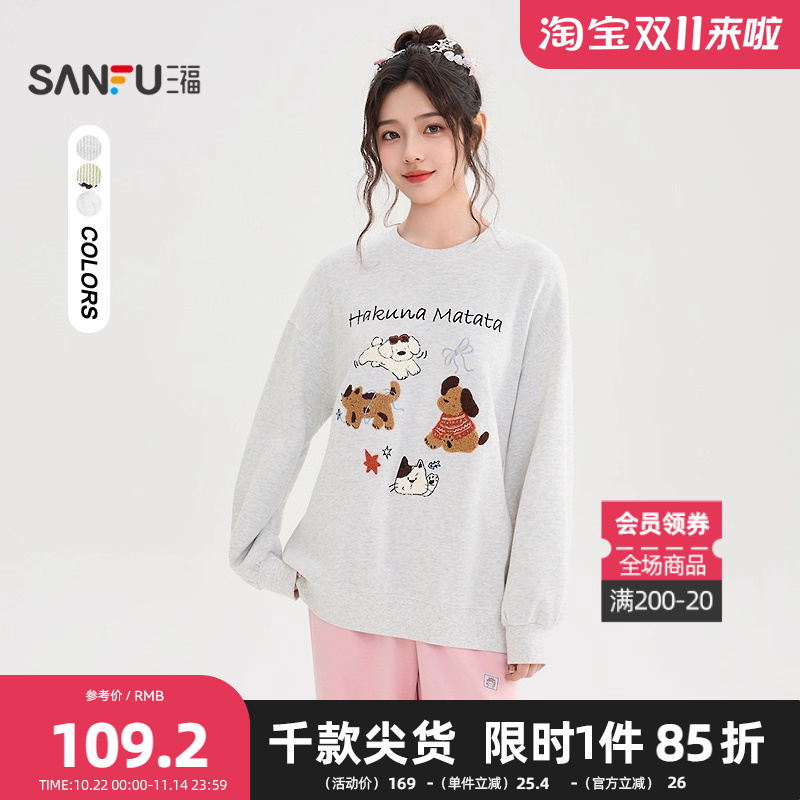 三福无帽卫衣女2025新款秋季可爱小狗绣花圆领宽松上衣女装508610