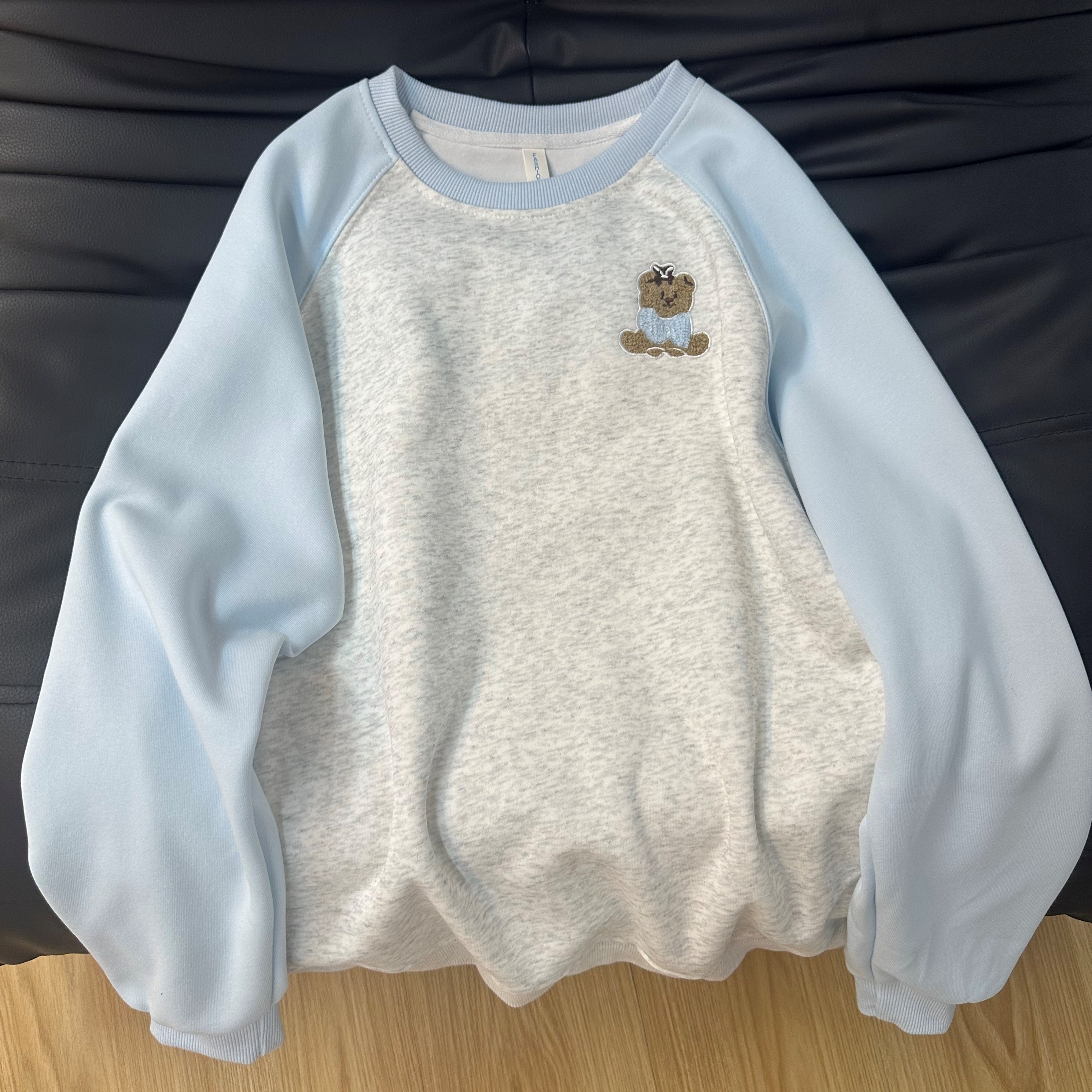 美式复古圆领卫衣女秋季撞色小熊刺绣oversize宽松百搭小个子上衣