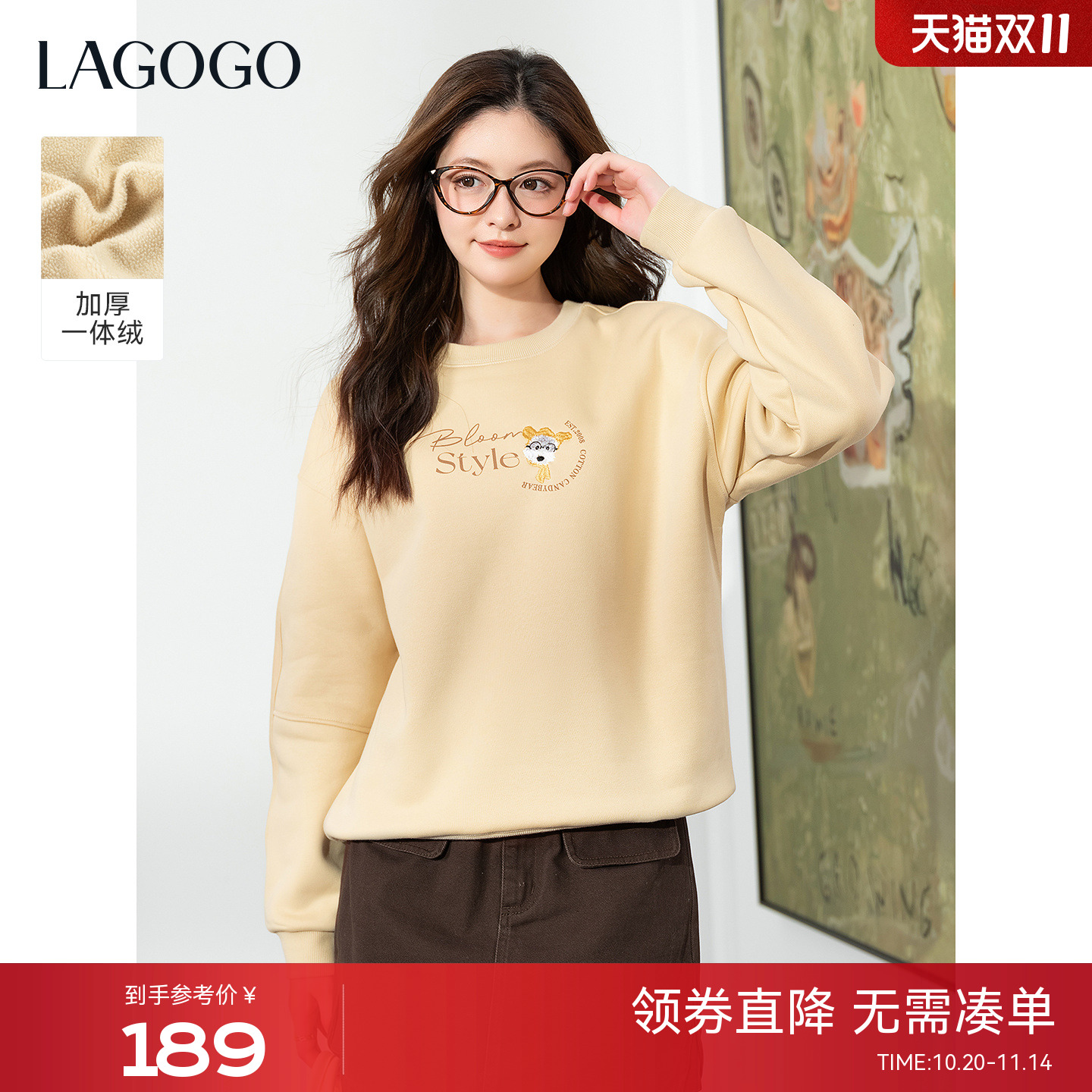 LAGOGO黄油泡芙圆领加绒卫衣女拉谷谷2025年冬季新款好看刺绣绒衫