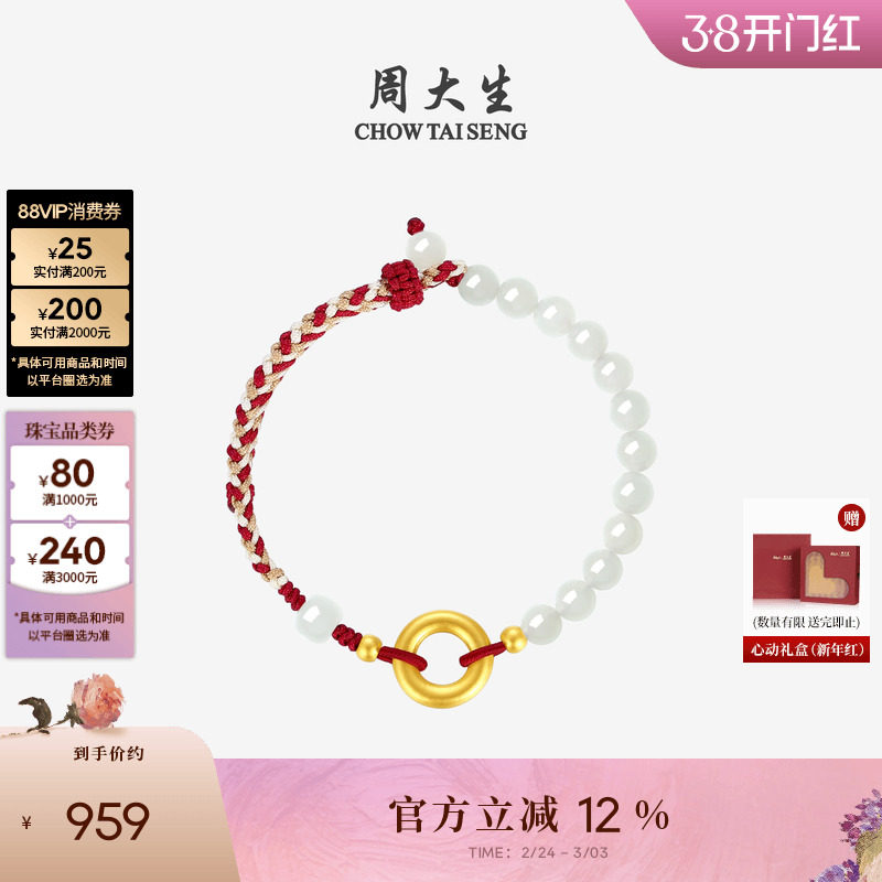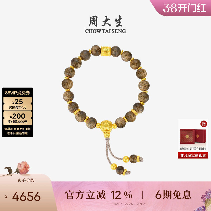 周大生沉香黄金手串男女足金木质男士手链情侣款生日礼物送男女友