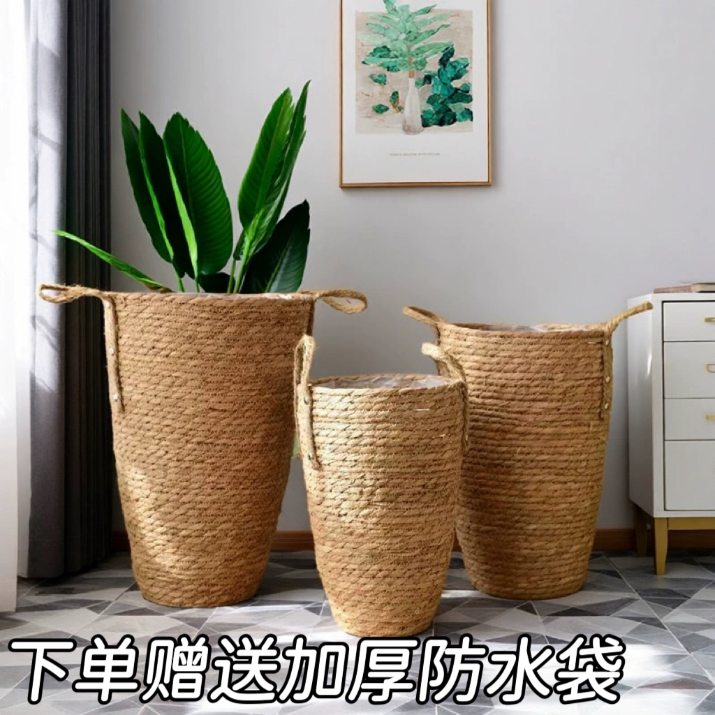 北欧网红草编花盆海草编织龟背竹花盆藤编花篮落地大花盆家居装饰
