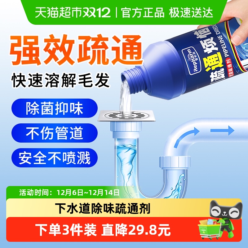 雷帕姆管道疏通剂管道通堵塞厨房油污浴室强力溶解马桶下水道除臭