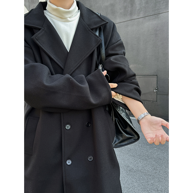 冬季黑色高级感双排扣毛呢大衣男装韩系中长款过膝加厚呢子风衣潮