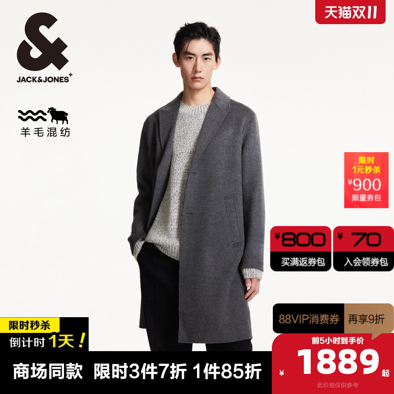 杰克琼斯冬季新款时尚潮百搭平驳领长款外套通勤日常毛呢大衣男装