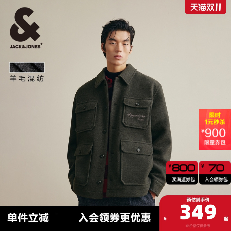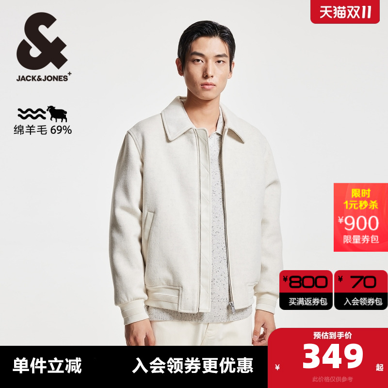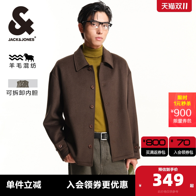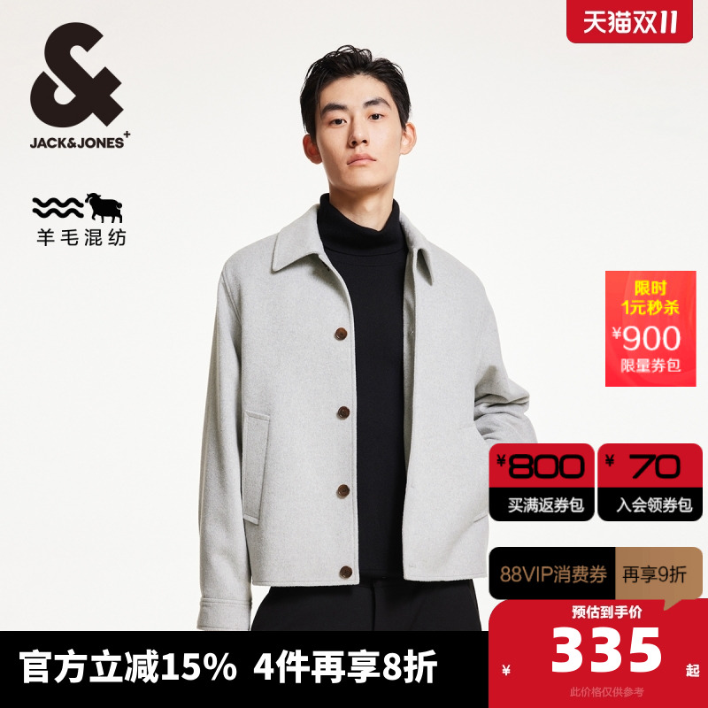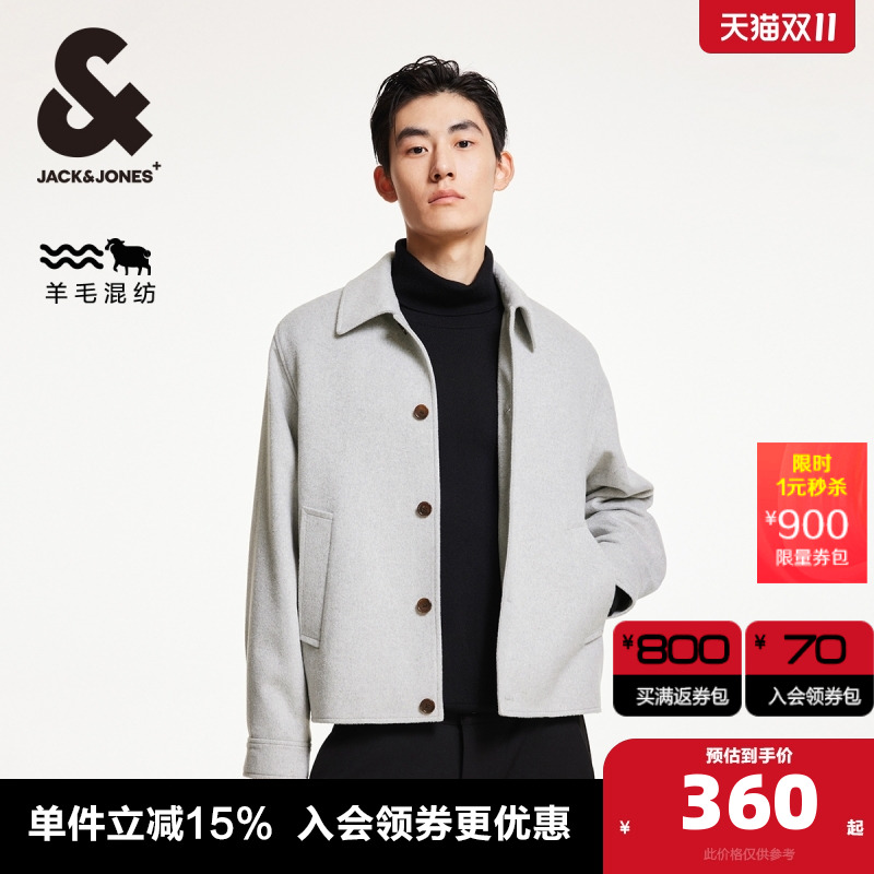 杰克琼斯秋冬新款质感纯羊毛外套短款毛呢大衣男装225427005