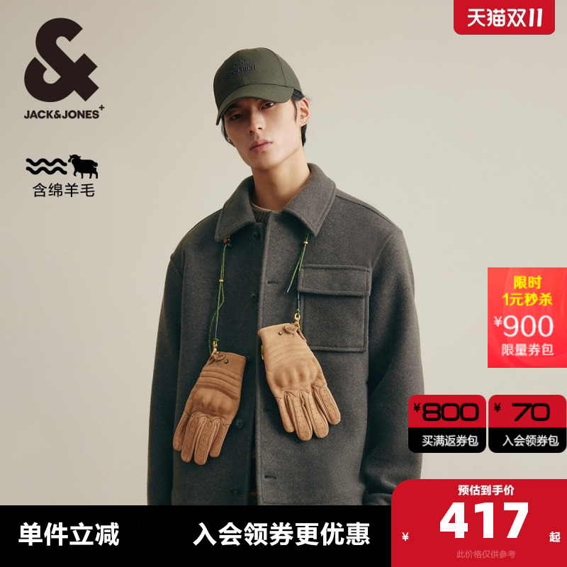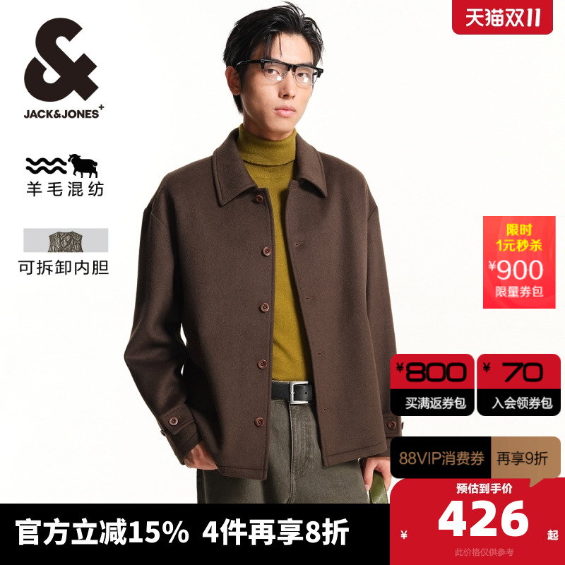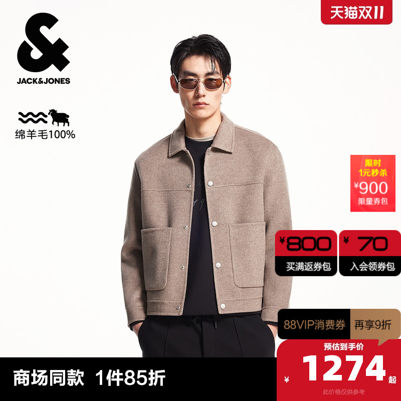 杰克琼斯冬季新款质感纯羊毛外套短款毛呢大衣男装225427005