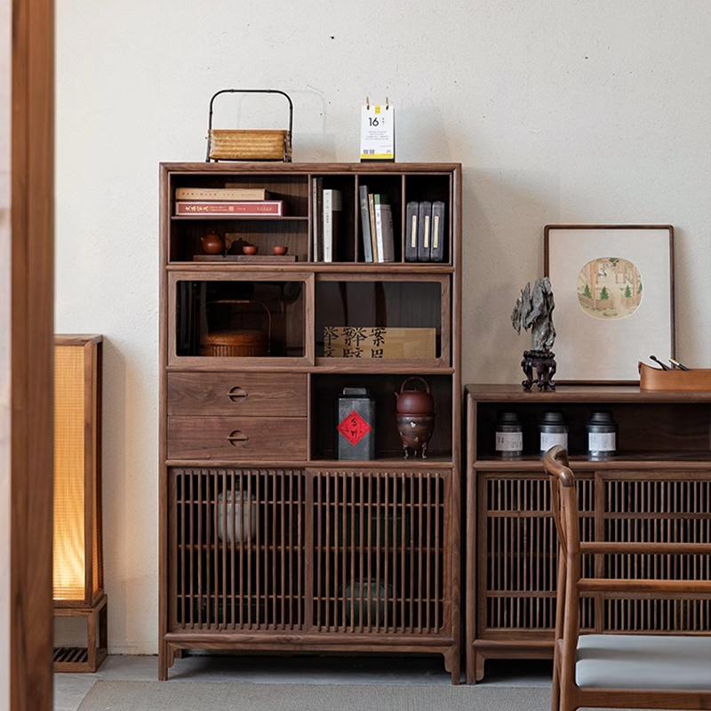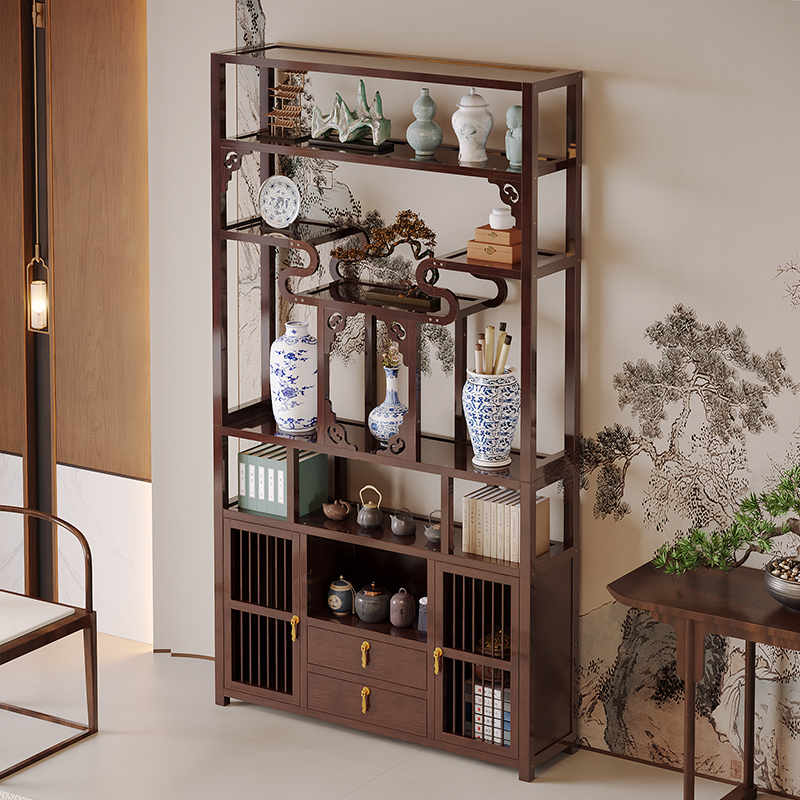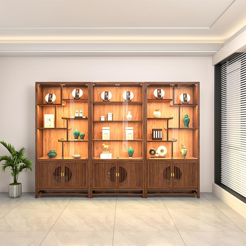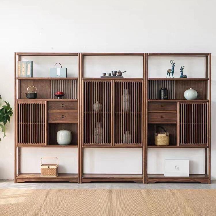 新中式多宝阁博古架置物架北美黑胡桃实木茶叶展示柜收纳茶室边柜