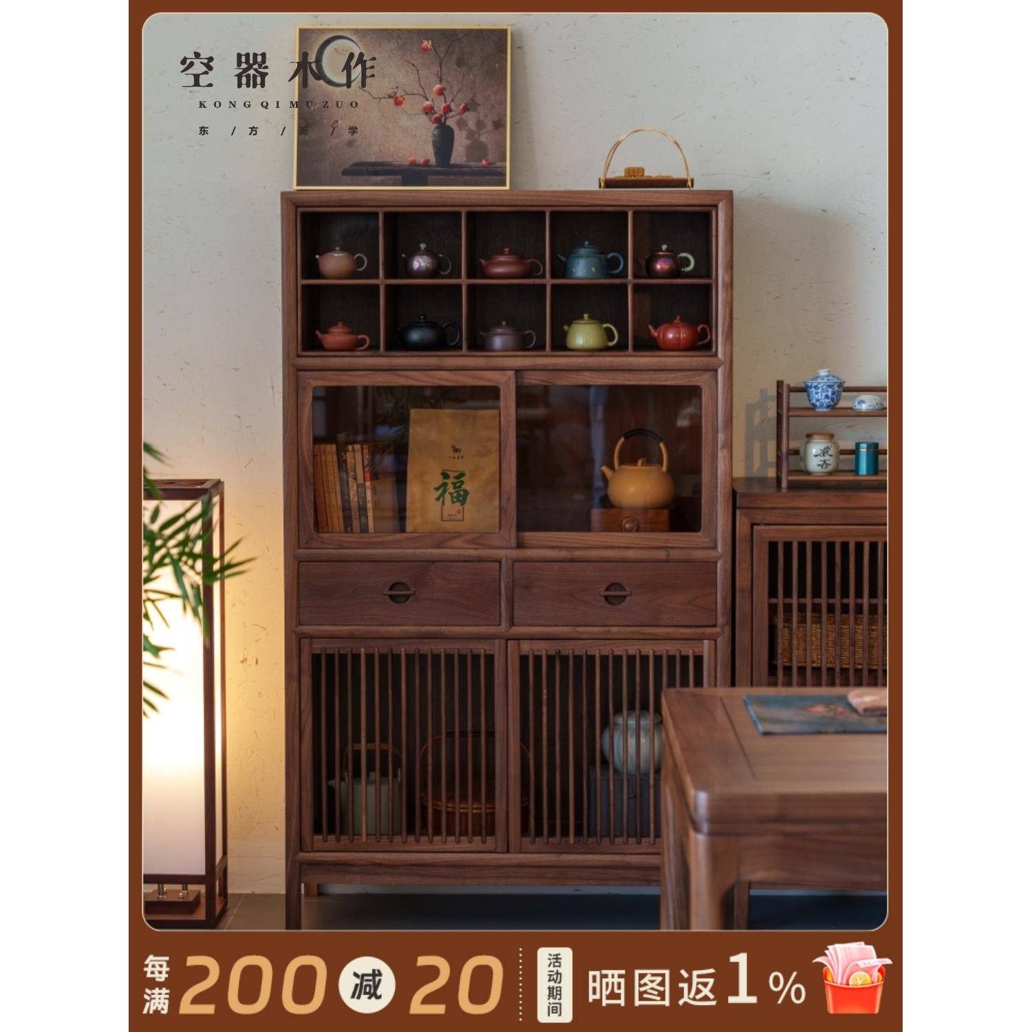 北美黑胡桃木茶具柜新中式茶边柜多宝阁博古架家用收纳茶柜置物柜