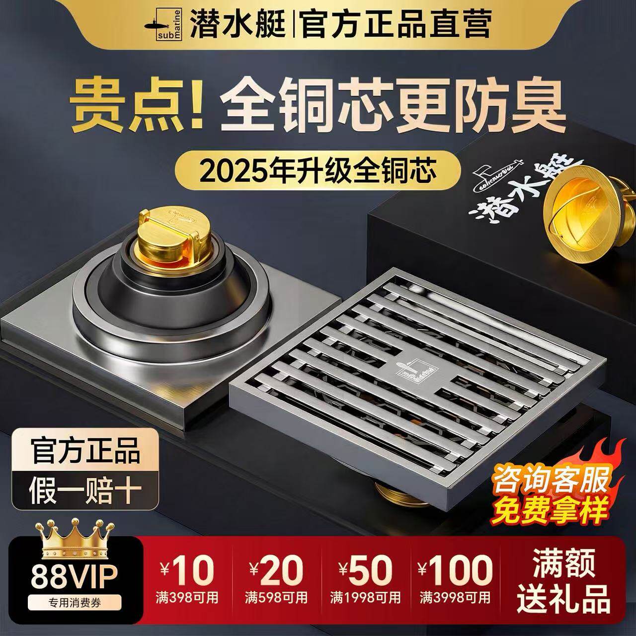 潜水艇全铜地漏防臭卫生间通用浴室洗衣机官方旗舰店正品下水道芯