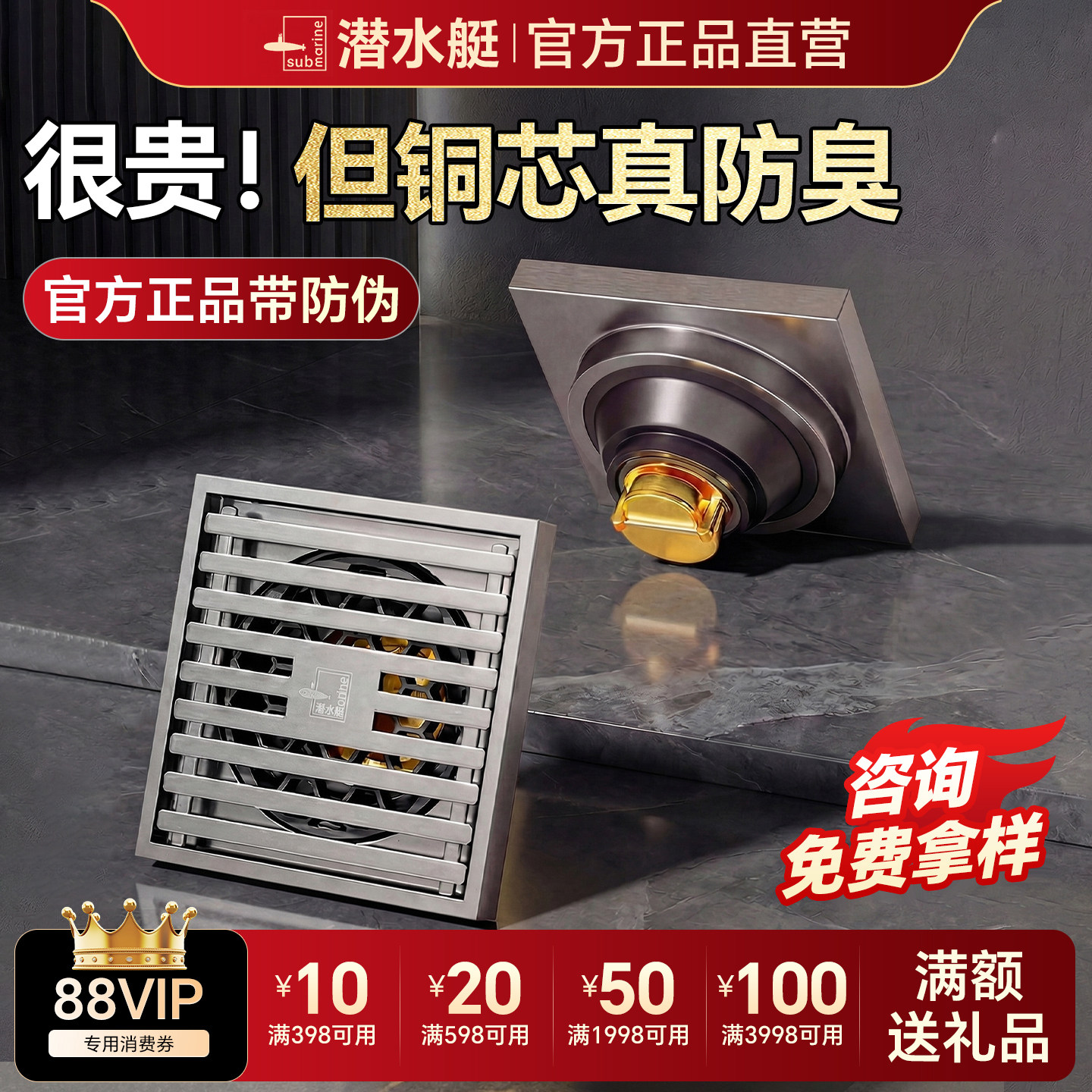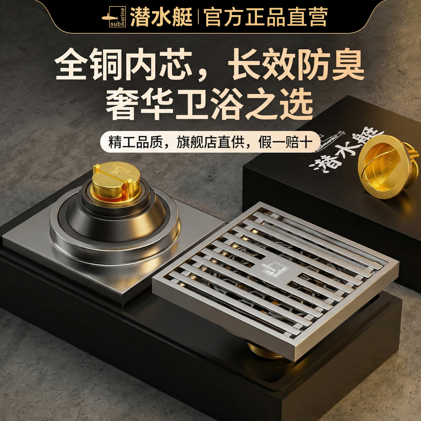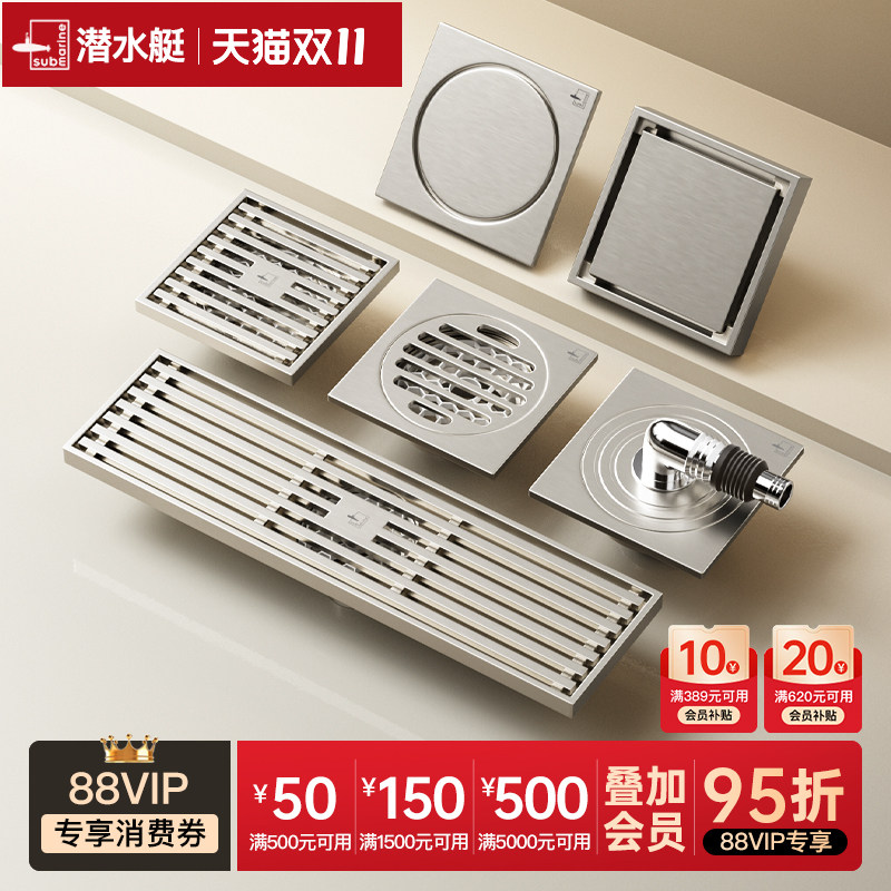 潜水艇官方旗舰店防臭全铜地漏卫生间洗衣机洗澡间通用正品下水道