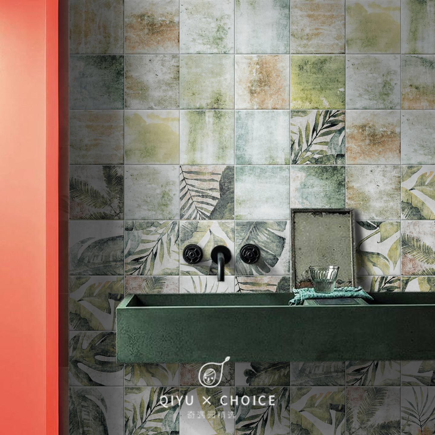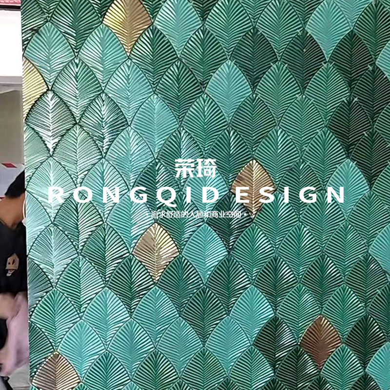 复古渐变墨绿棕榈叶树叶手工砖别墅酒店背景墙金色特色卫生间瓷砖