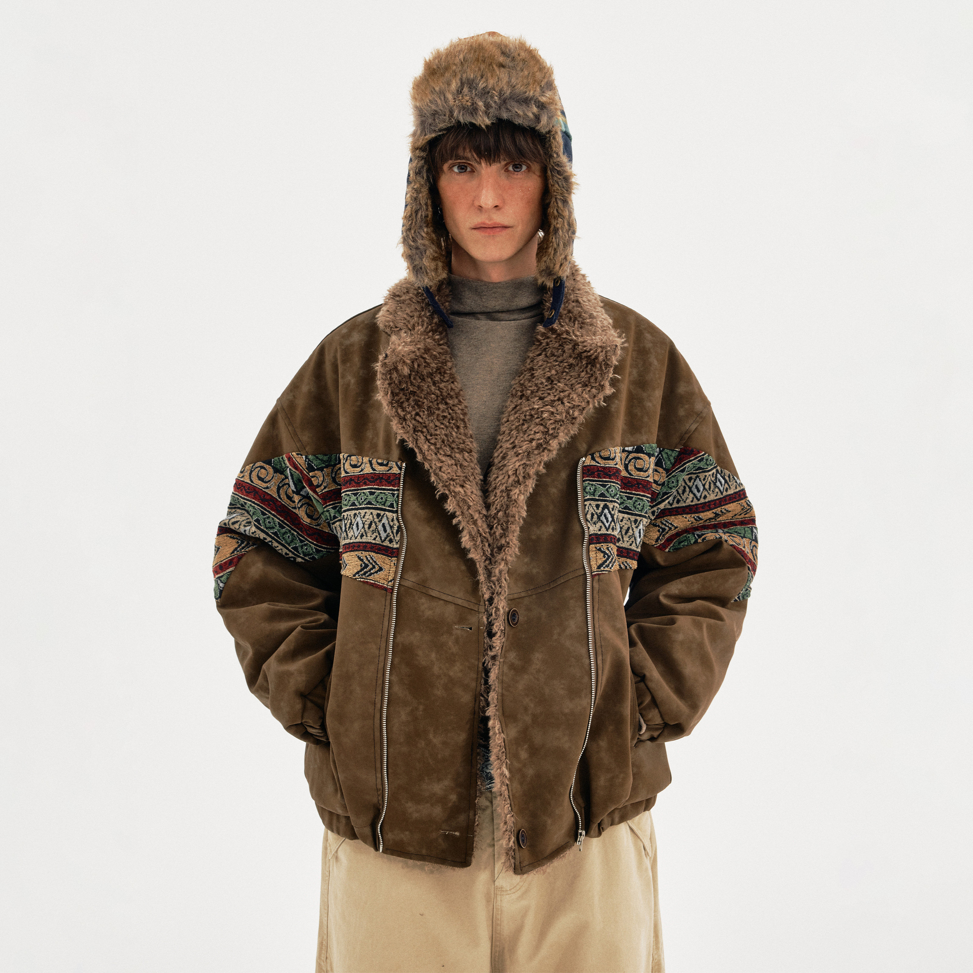 MADWITCH复古民族风仿麂皮刺绣棉服男女冬季休闲加厚保暖毛领外套