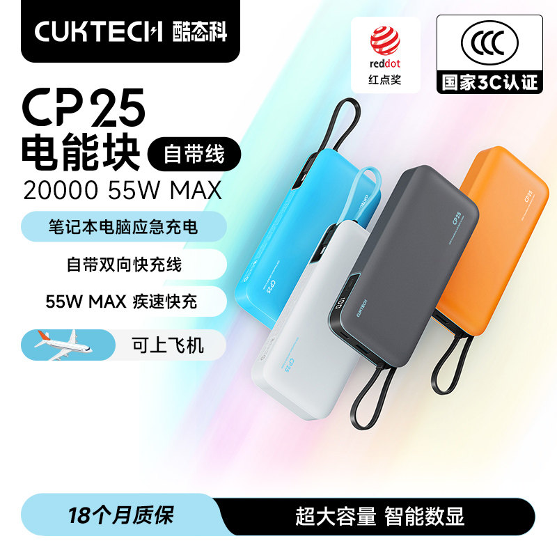 【3C认证可上飞机】CUKTECH酷态科2026新款充电宝CP25自带线电芯20000毫安时移动电源PD快充轻薄本笔记本电脑