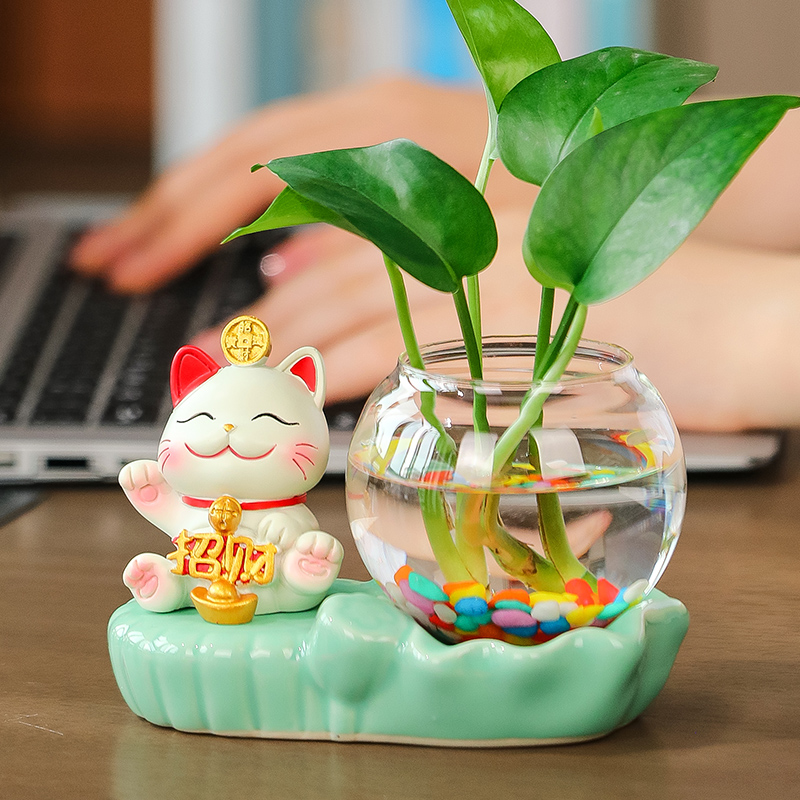 可爱招财猫青瓷水培玻璃器皿办公室桌面装饰治愈系摆件创意小花瓶