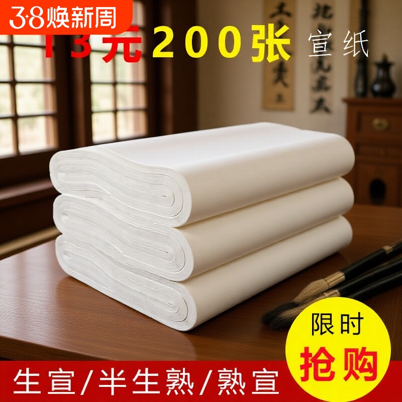 四尺六尺对开生宣纸批发初学者加厚生宣画画安徽泾县练字清仓小楷毛笔工笔画熟宣国画书法专用半生半熟100张