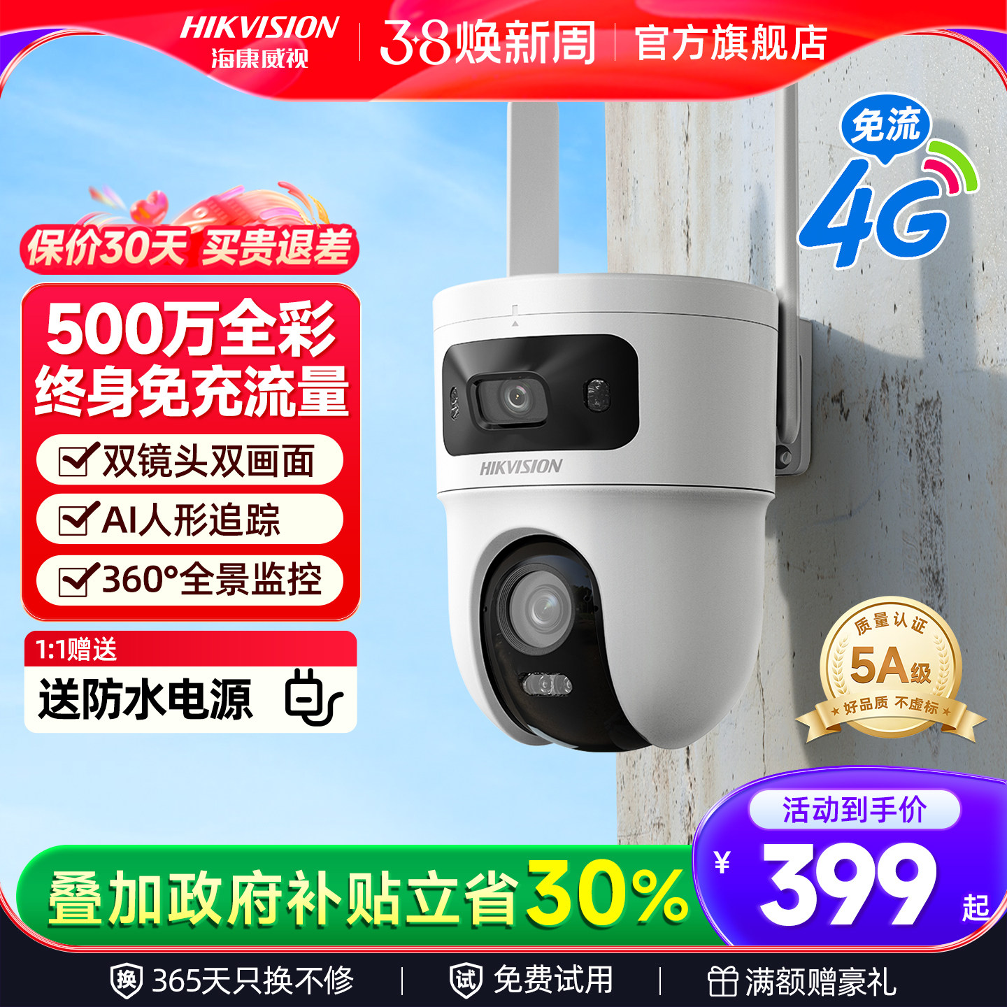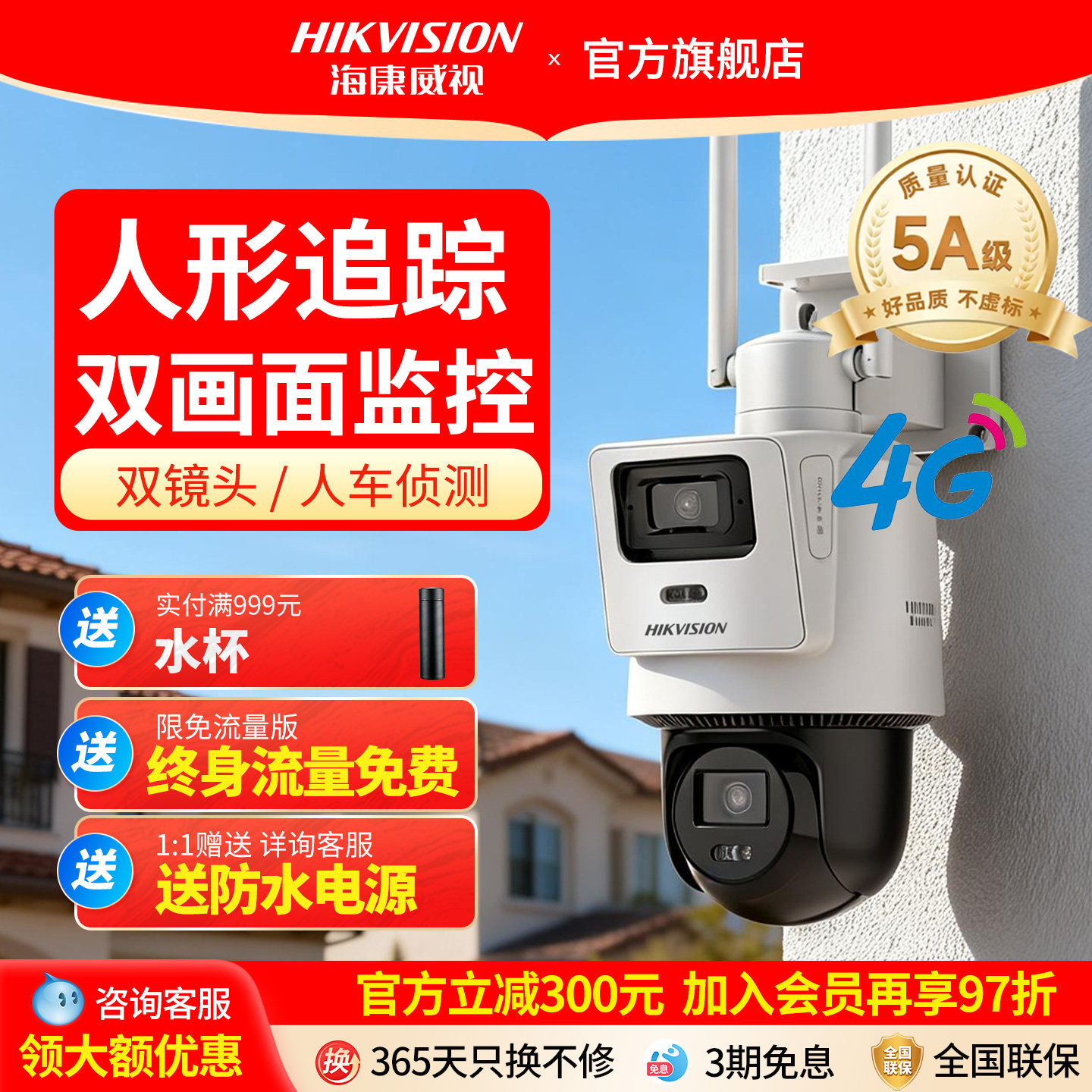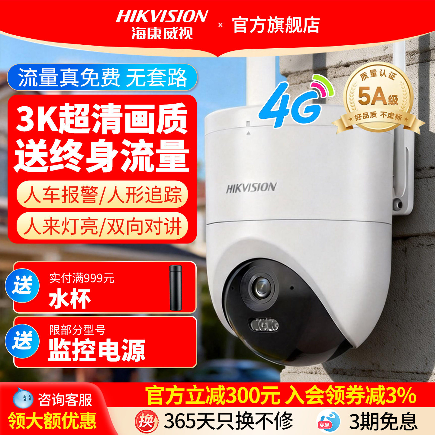 海康威视4G终身免流量监控摄影头网络摄像机360度无死角室外球机