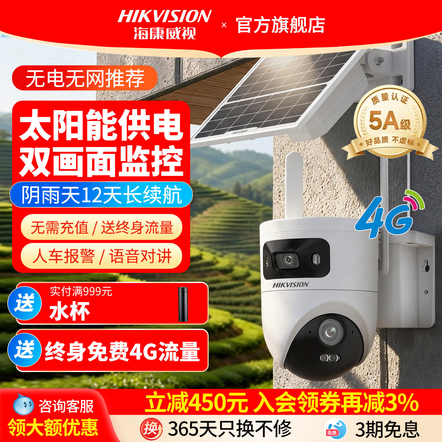 海康威视官方旗舰4g太阳能监控器摄像头360度室外免插电无需网络