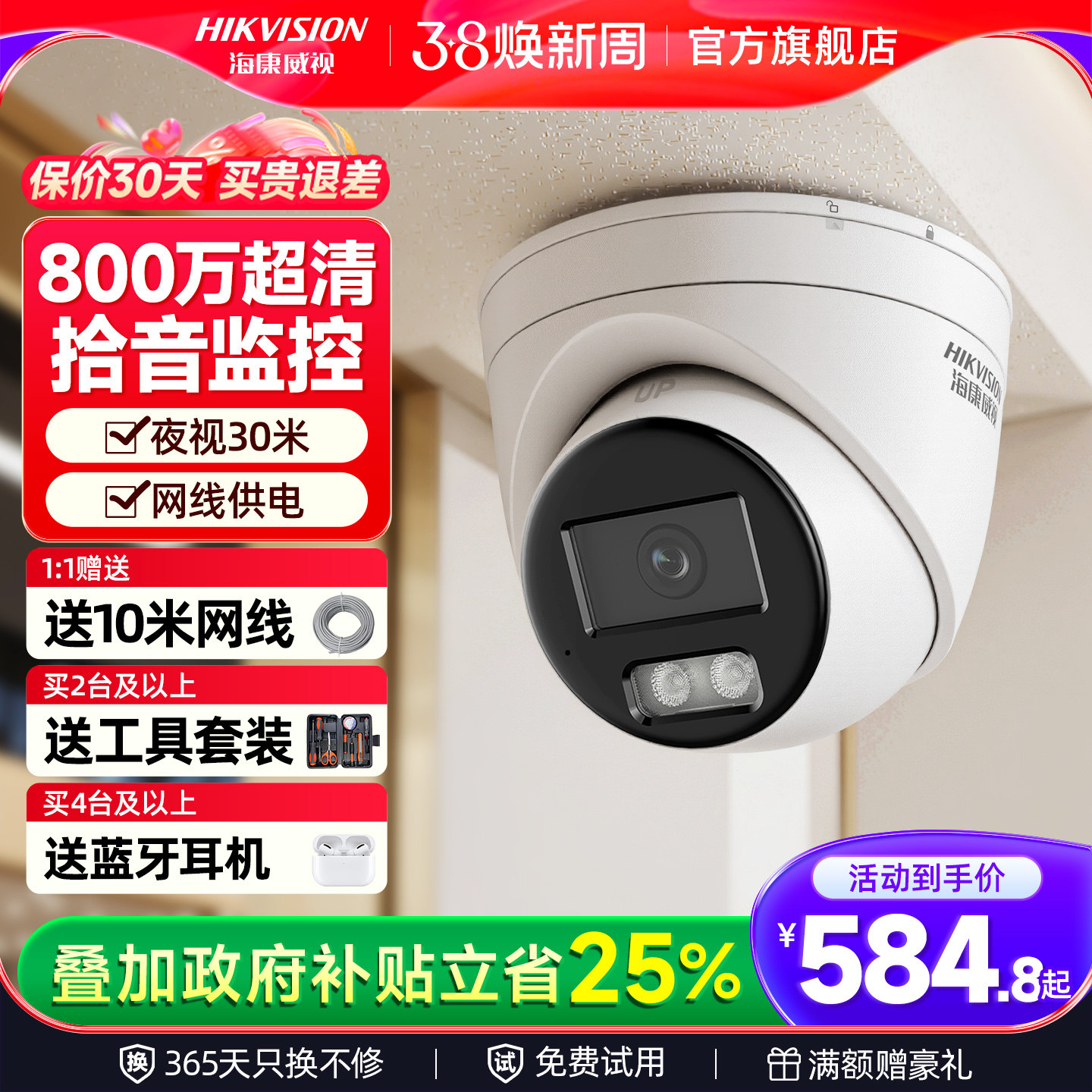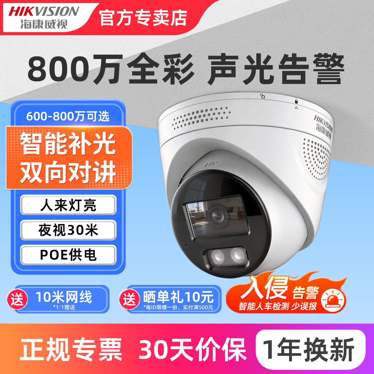 海康威视200/400万全彩监控摄像头高清夜视内置录音POE供电半球