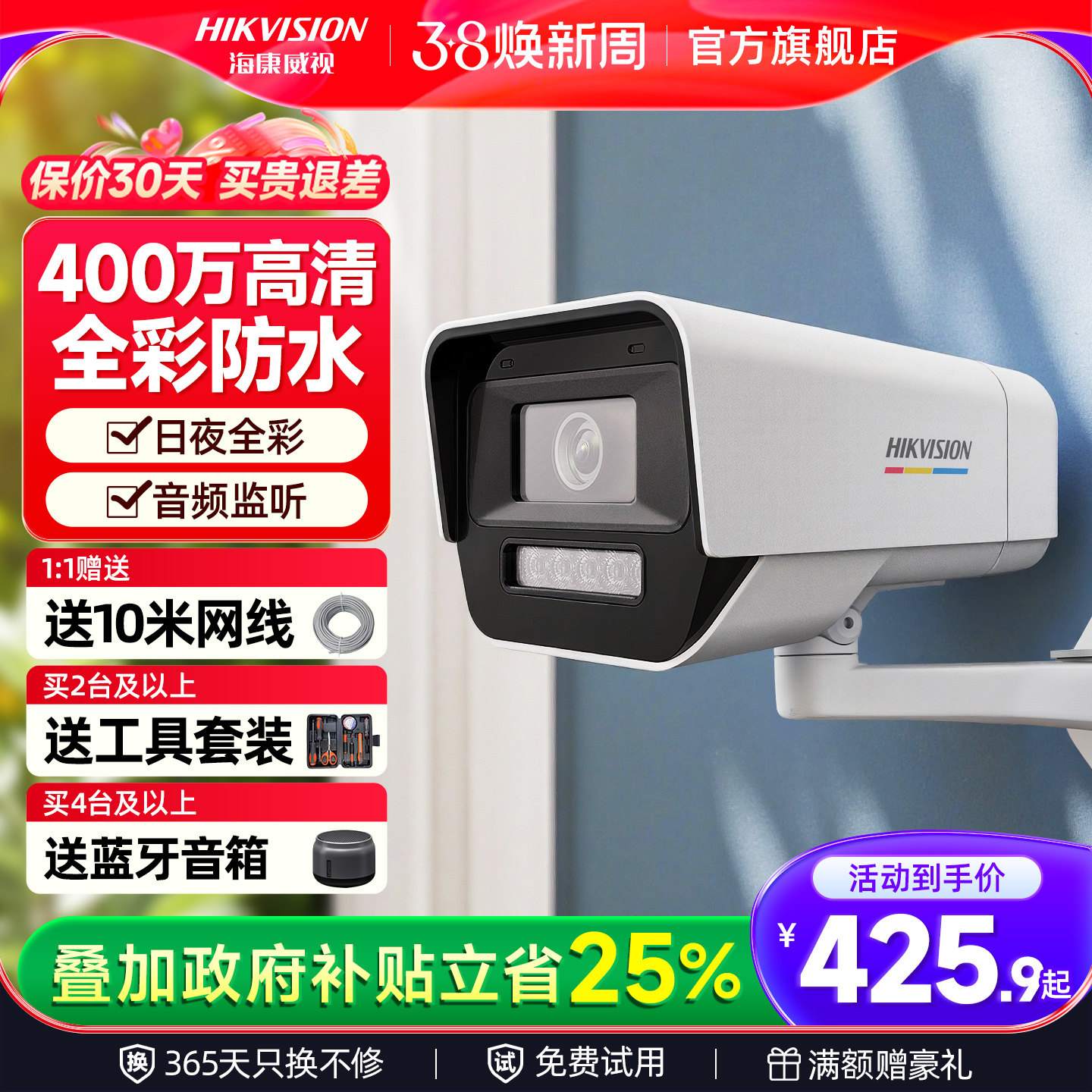 海康威视400万全彩网络摄像头户室外高清夜视可连手机远程监控器