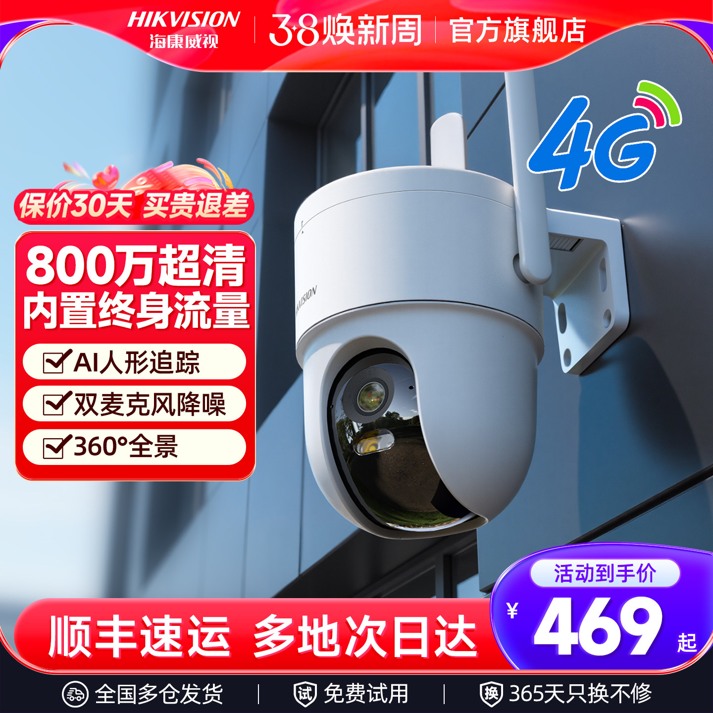 海康威视4G商用网络监控器摄像影头800万免流量超高清连手机远程