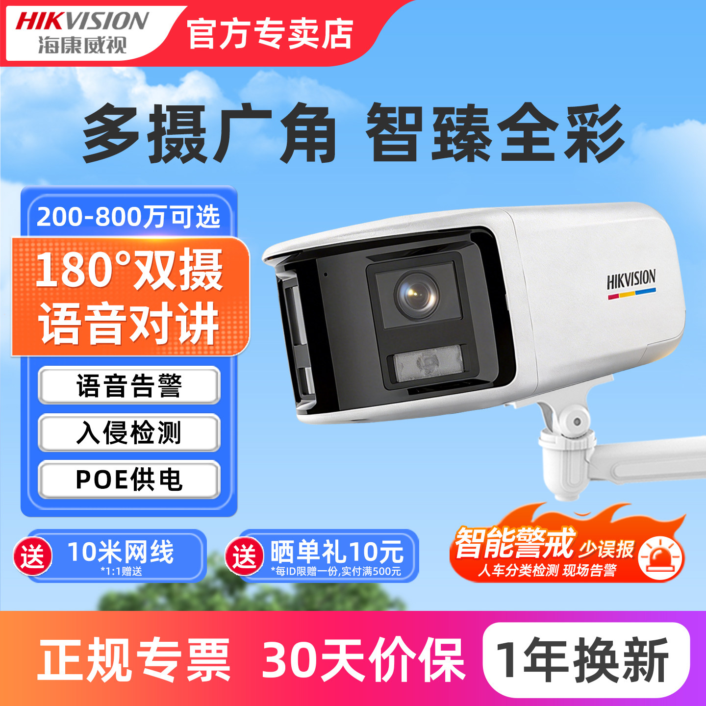 海康威视监控摄影头800万poe网络180°双摄广角夜视臻全彩摄像机