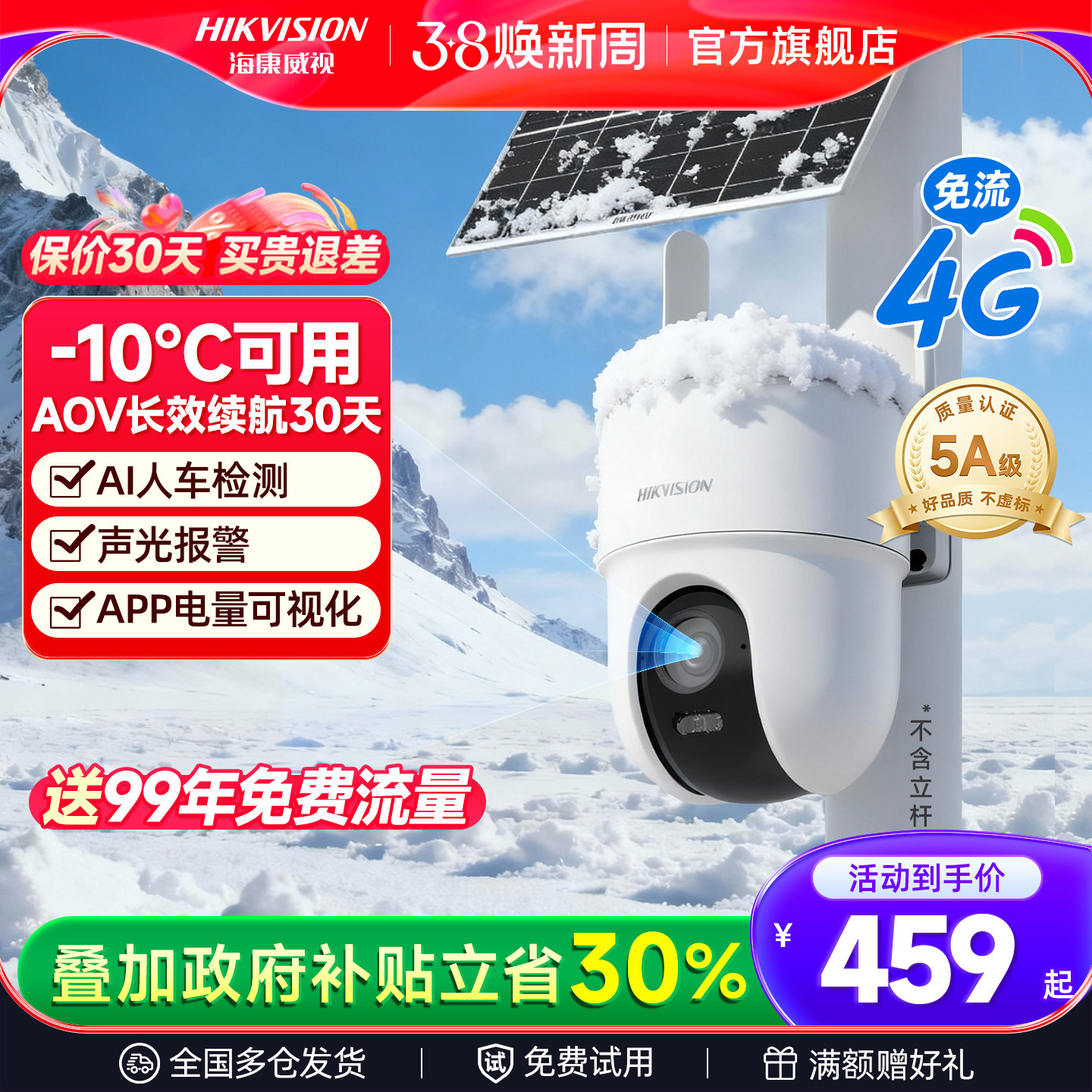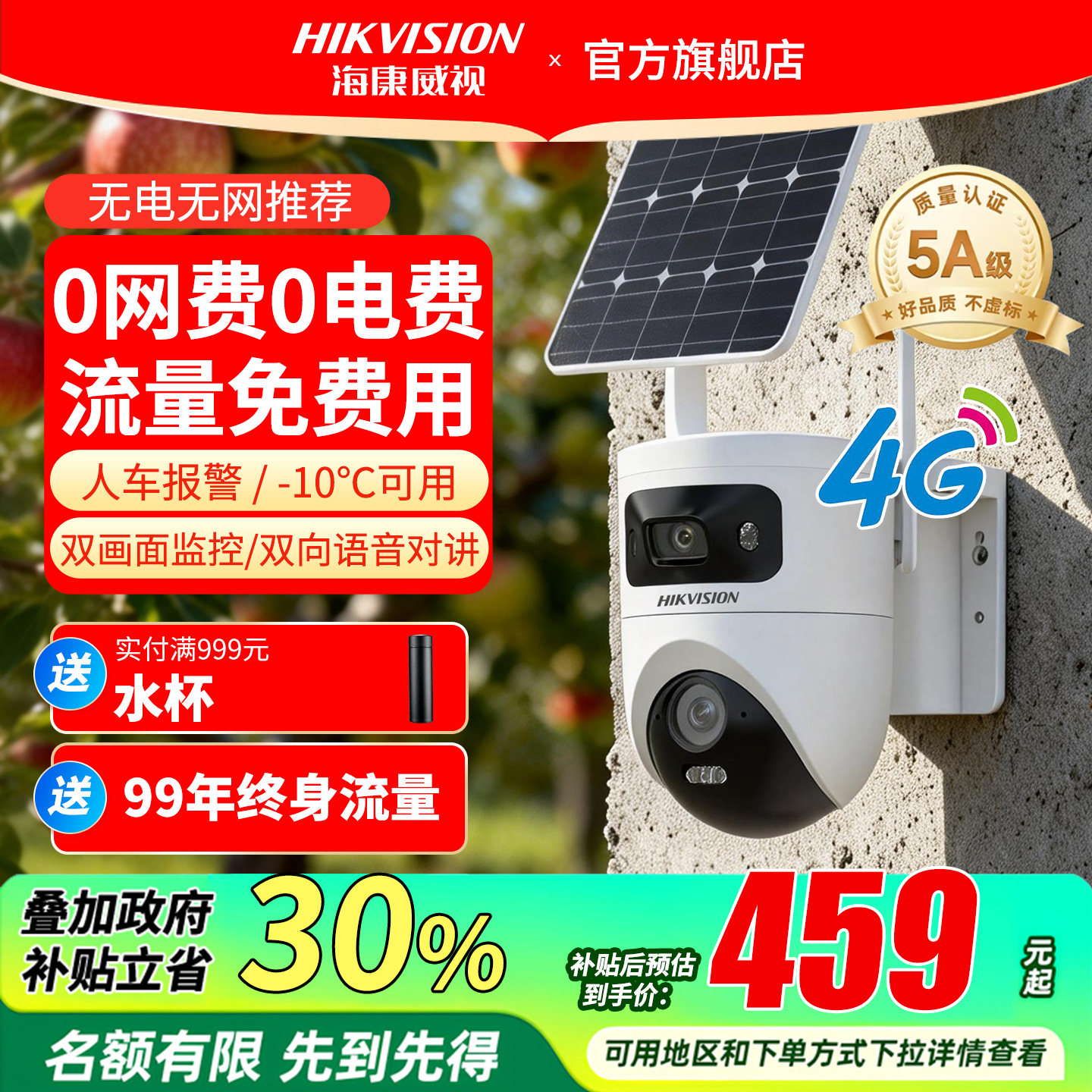 海康威视太阳能4g摄像头400万高清连手机远程无需网络户外监控器