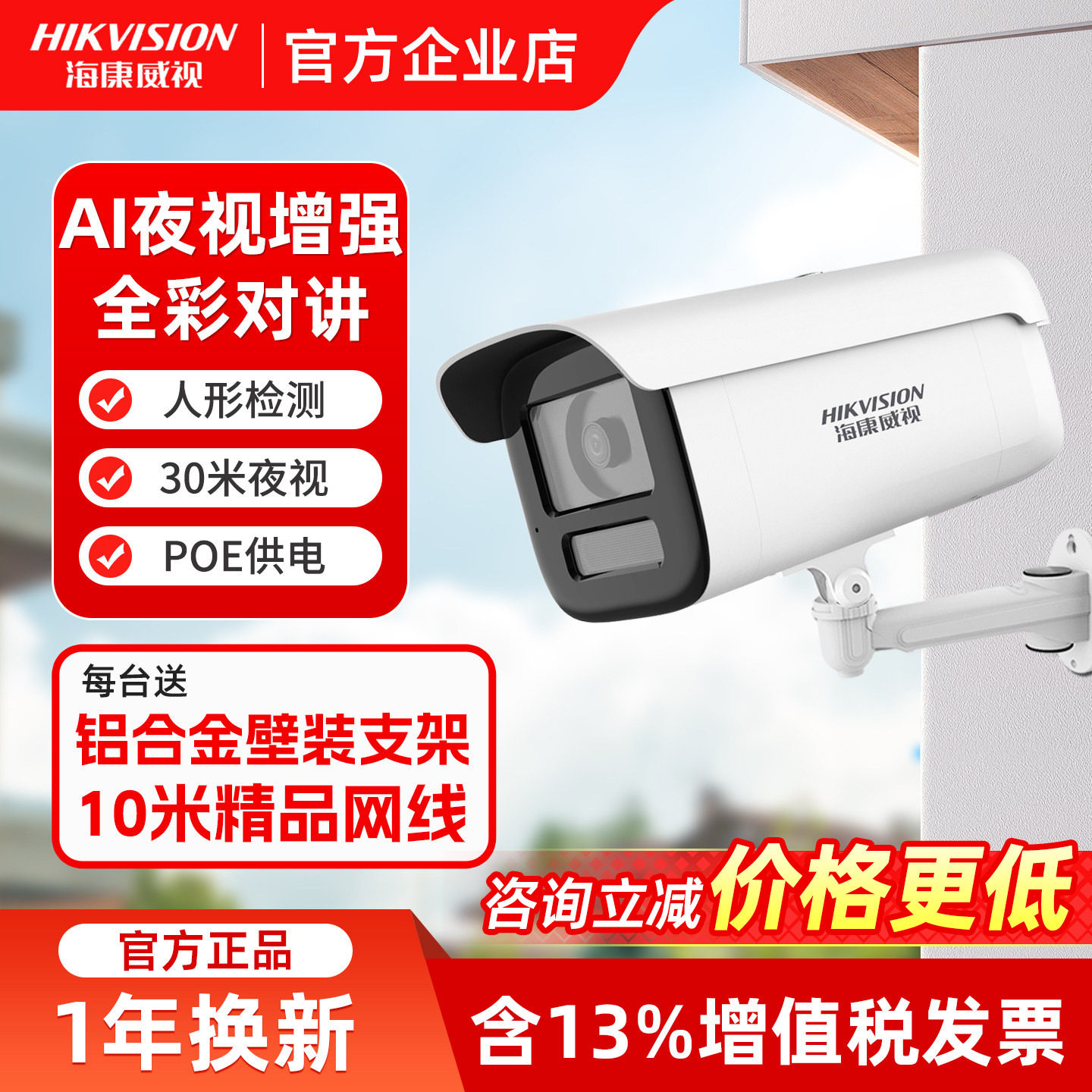 枪机支持海康400万网络摄像机智能全彩室外摄像头高清监控供电