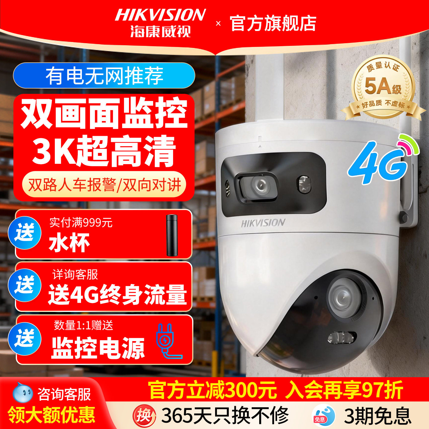 海康威视4G摄像影头家用360度无死角监控器无需网络官方旗舰店