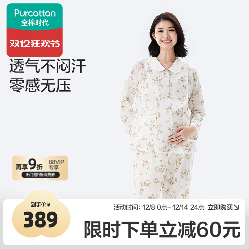 全棉时代孕妇家居服纯棉纱布舒适哺乳喂奶产后月子套装睡衣女礼物