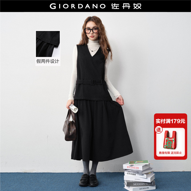 设计师款佐丹奴无袖裙子女黑色假两件V领腰带背心连衣裙18465709