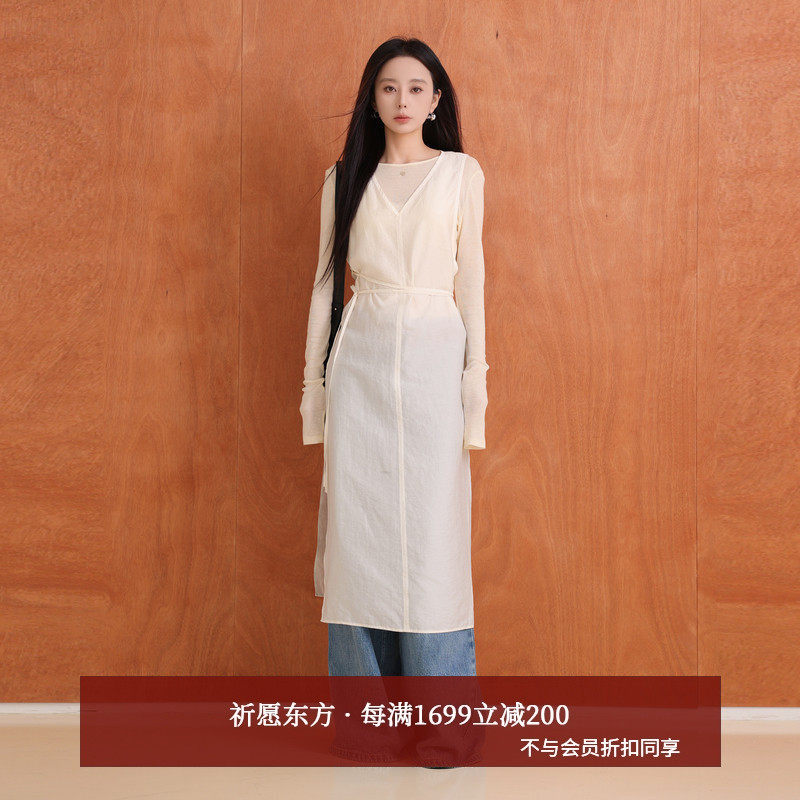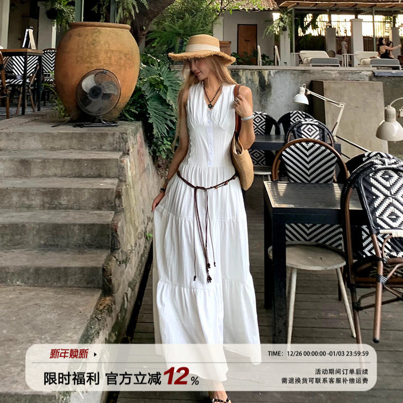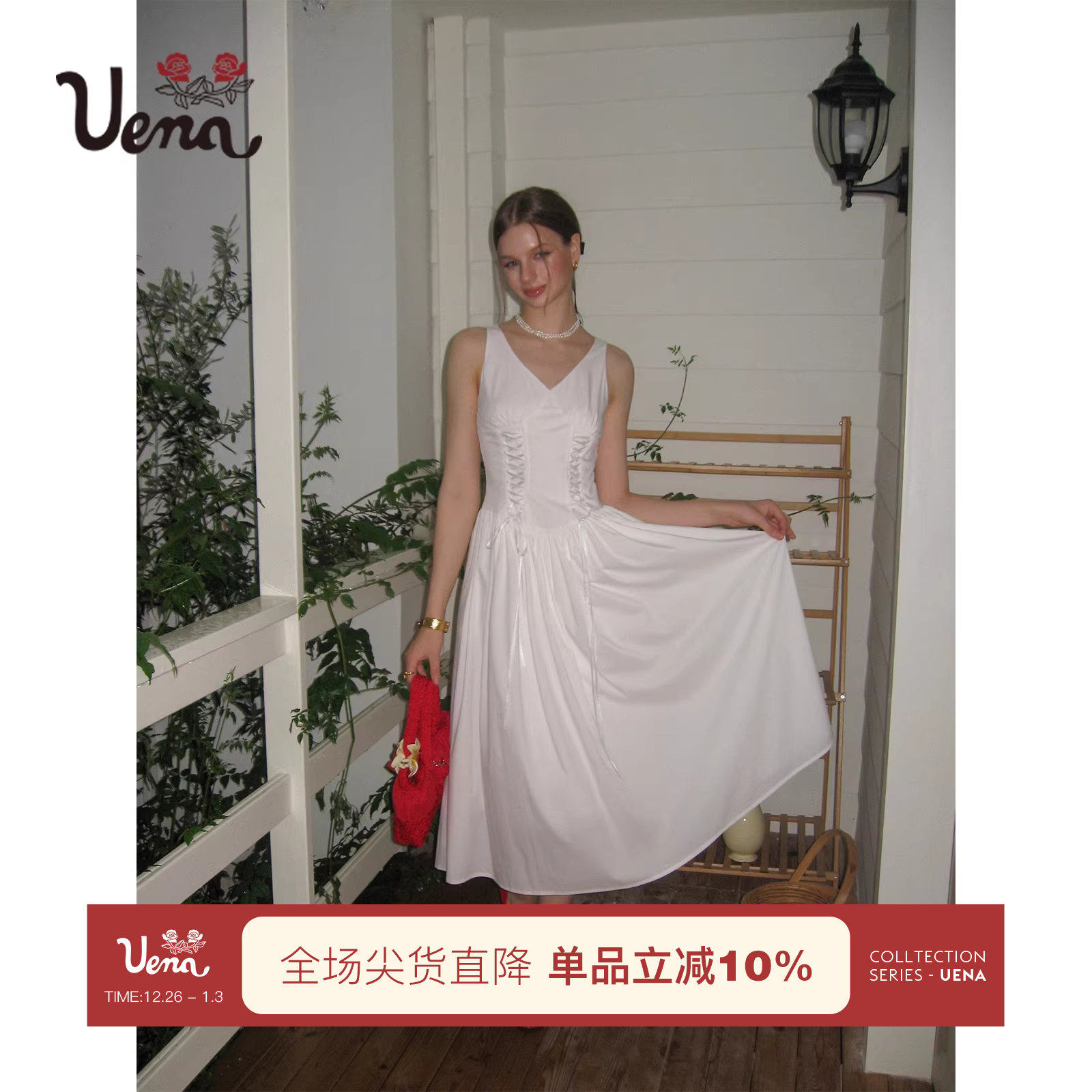 【梦中的蝴蝶】Uena白色腰部抽褶抽绳绑带A字长款v领背心连衣裙女