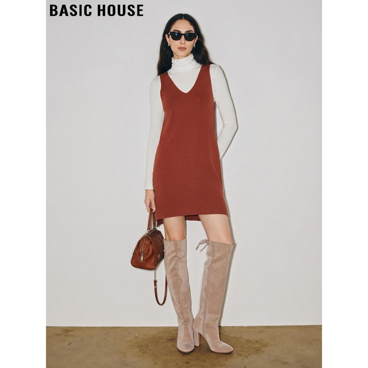 Basic House/百家好红色V领背心连衣裙女春季叠穿显瘦无袖马甲裙