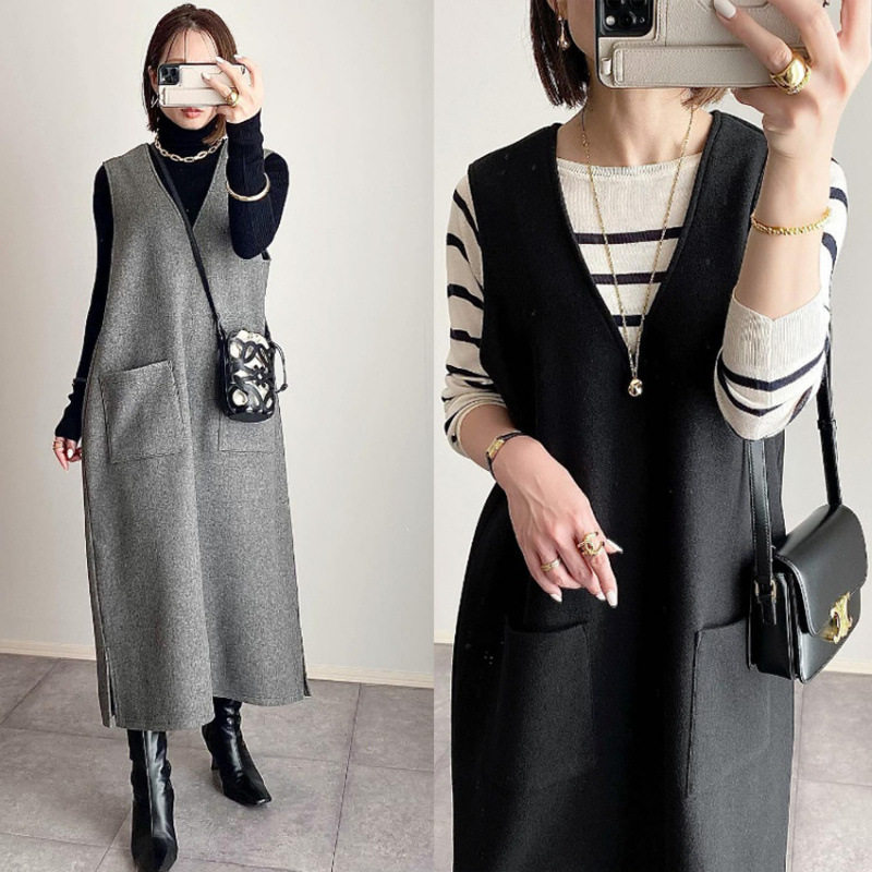 pusumede 雅致书卷 V领背心连衣裙女秋冬气质收腰毛呢中长款裙子