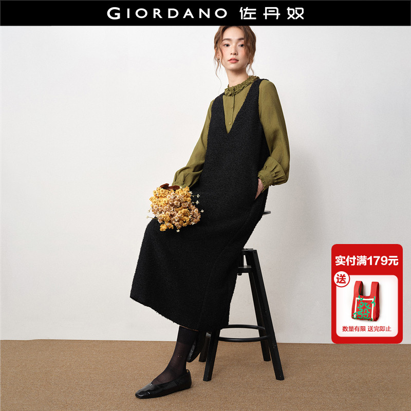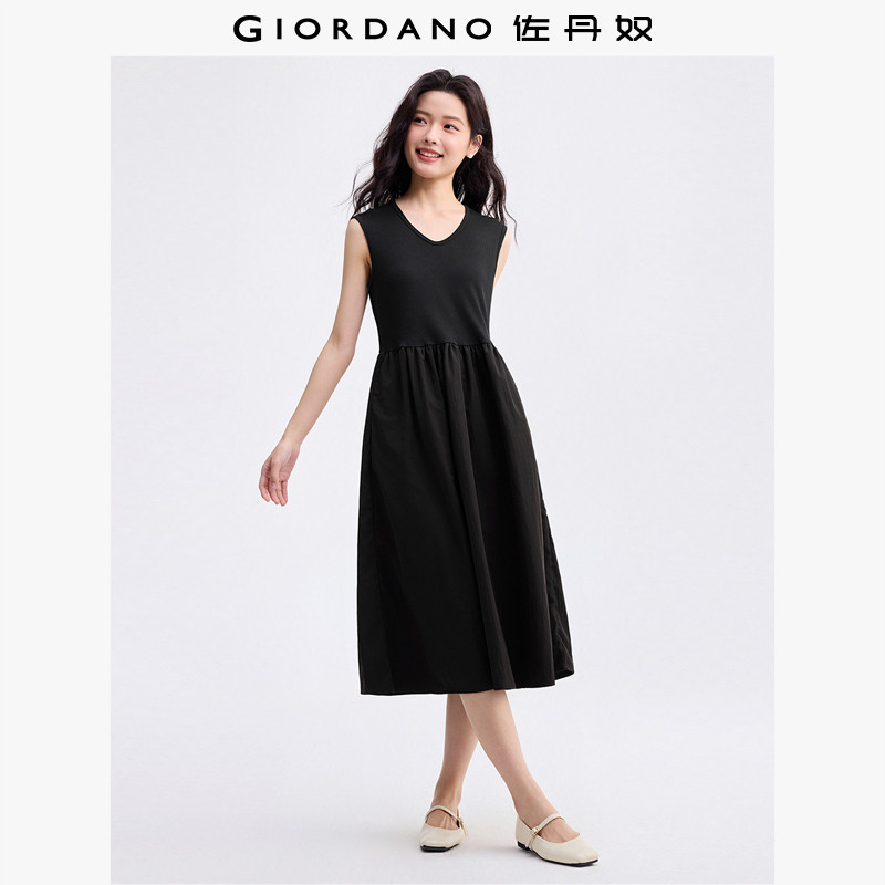 设计师款佐丹奴无袖裙子女肌理感黑色开叉V领背心连衣裙18465538