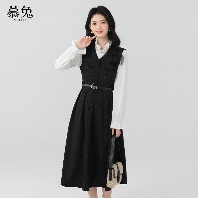 慕兔法式小香风V领背心连衣裙女秋2025新款内搭长袖衬衫两件套装