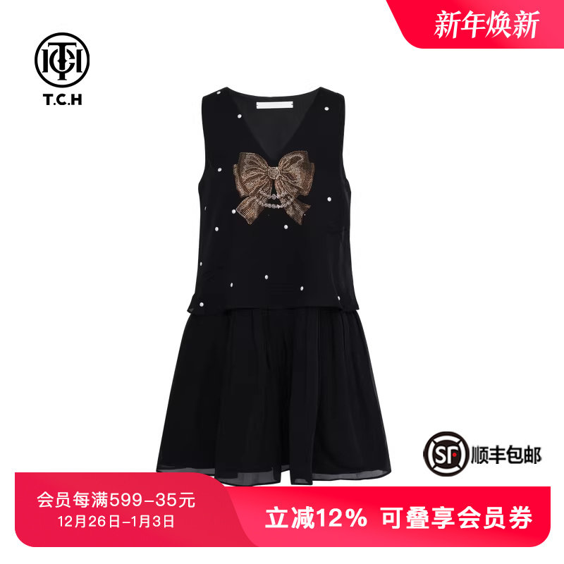 TCH轻奢夏季新款烫钻V领背心连衣裙女黑色百褶短裙T75B30E1091