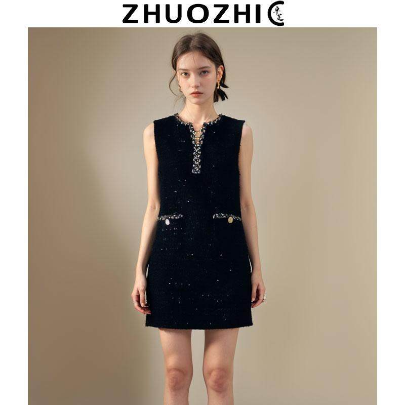 【爆款】卓芝轻奢小香风半开V领背心连衣裙2024冬季新款直筒短裙