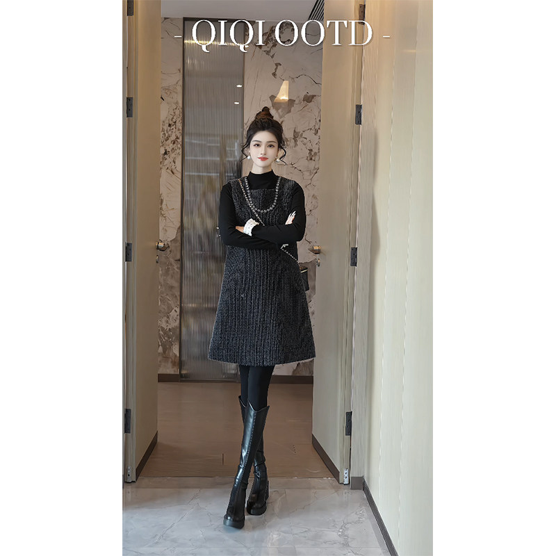 柒院家大码小香风轻奢气质V领背心连衣裙2025秋冬宽松显瘦中长裙